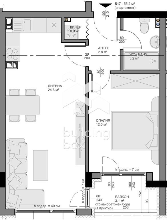 РАЗПРЕДЕЛЕНИЕ: Всекидневна с кухненски бокс с площ от 24.60 кв.м., спалня - 12.00 кв.м., антре, баня и тоалетна, килер, балкон.