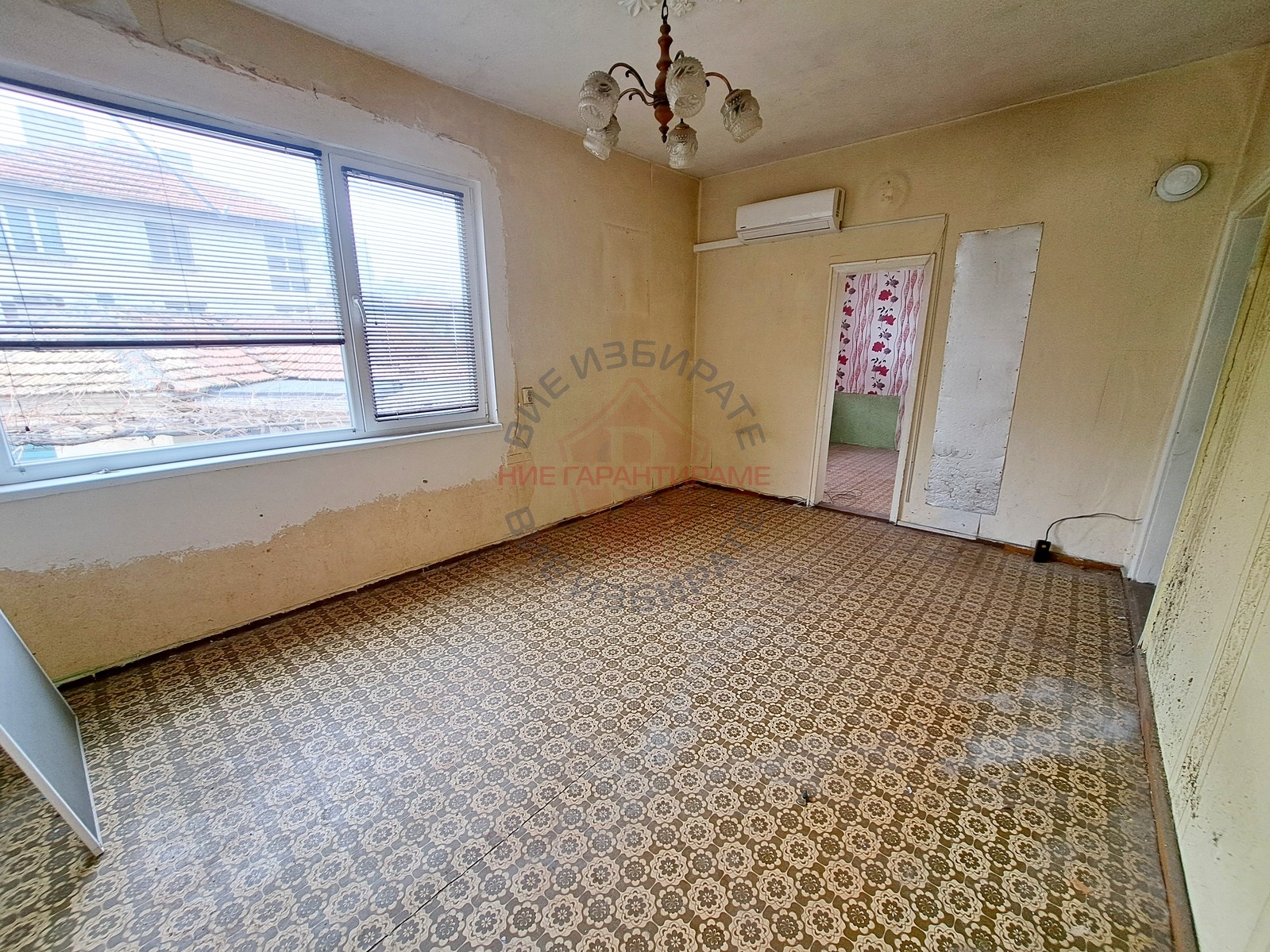 РАЗПРЕДЕЛЕНИЕ на имота: първият етаж се състои от входно антре - салон, който може да се използва като лятна кухня, всекидневна, голям хол, две спални, кухня, широк коридор и два санитарни възела. Има възможности за преустройство на стаите. Състоянието е за ремонт, частично подменена пвц дограма, климатици. Полусутеренът се състои от склад-маза и две помещения, които могат да се пригодят за живеене. Има самостоятелен вход, който е за целия имот и се ползва само от тези собственици. Има и втори вход - изход. Дворното място е с площ от 200 м2, в идеална съсобственост, но е оградено и също се ползва самостоятелно. Подходящ за две семейства или отдаване под наем, след реновиране.