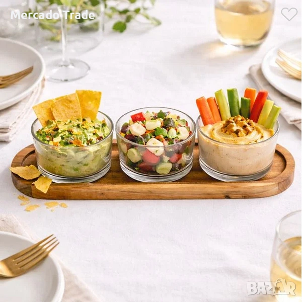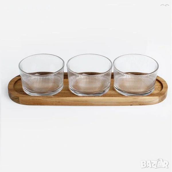 Поставка за ордьоври от акациево дърво с 3 прозрачни стъклени купички (Ø8,5x5 см). Идеална за сервиране на ядки, снакс и плодове.