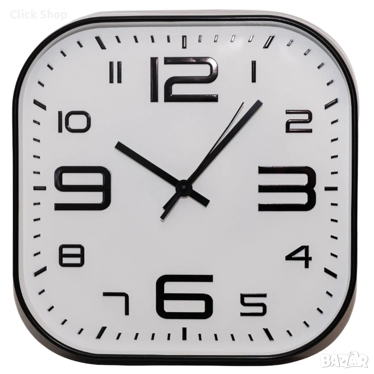 Модерен стенен часовник в бял цвят, с изчистен и елегантен дизайн, който се вписва лесно във всеки интериор. Контрастните черни цифри и стрелки осигуряват отлична четимост, а квадратната форма със заоблени ъгли придава съвременен и стилен облик.