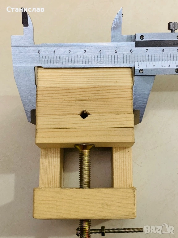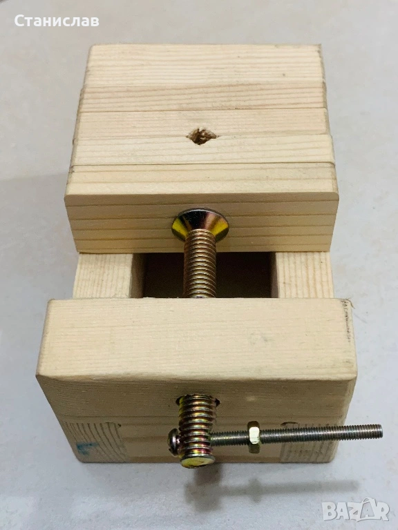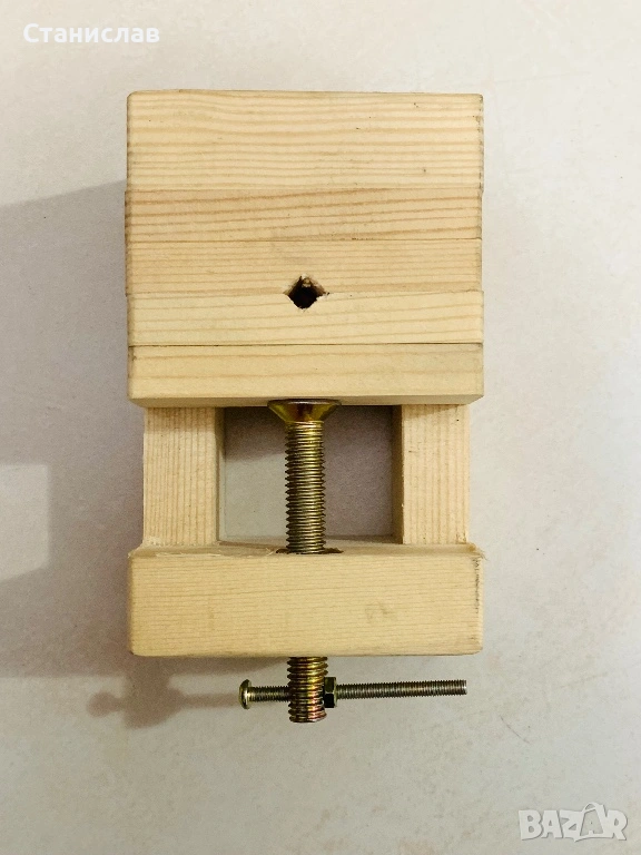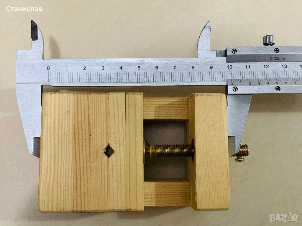 Предлагам мини дървено менгеменце, с размери 100мм (дължина) / 64мм (широчина). Подходящо за фина работа. Може да се монтира за дърводелски плот, и да служи като допълнителен помощник за дребни операции.