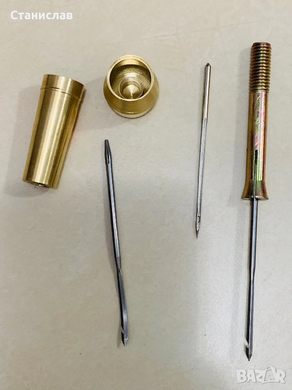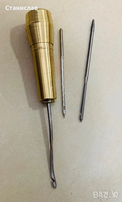 Предлагам месингов държач с цанга и 3 различни накрайника във вид на стоманени игли, за вадене на конец или въже, при шиене на груби, дебели платове, кожи, и тем подобни.