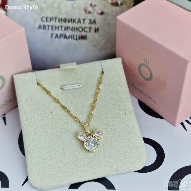 🐭 Елегантно колие с форма на Мики и бял блестящ камък.