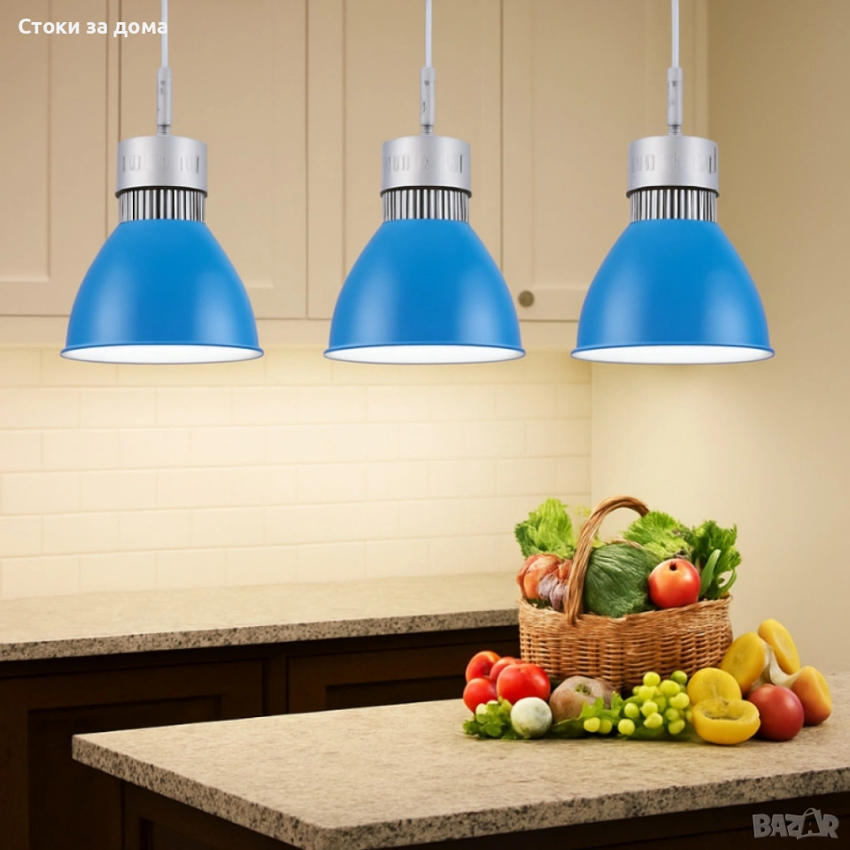 LED висяща лампа – 30W топла светлина за плотове, острови и витрини (Ø250×H280 мм, синя)