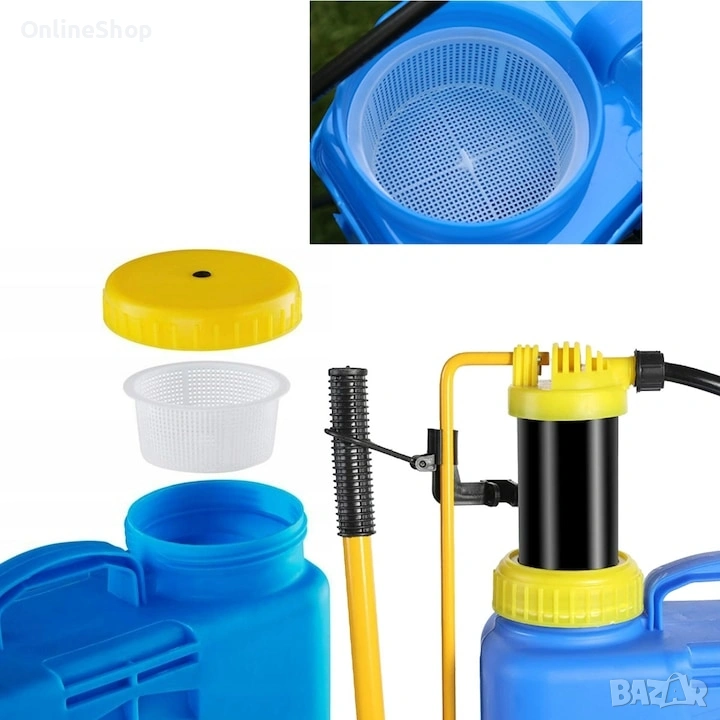 Дизайнът е изчистен, функционален и създаден за интензивна работа. Големият отвор за пълнене с цедка улеснява добавянето на течности без задръстване, а нивелиращата скала върху корпуса позволява прецизно измерване на количеството. Тръбата с дължина 70 см има дръжка с функция за автоматично пръскане, което носи реално облекчение при третиране на по-големи площи. Маркучът от 120 см дава възможност за използване директно от долния контейнер, без нужда от обръщане или допълнителни усилия. Визията в ярко синьо и жълто улеснява разпознаването и придава професионален вид на оборудването.