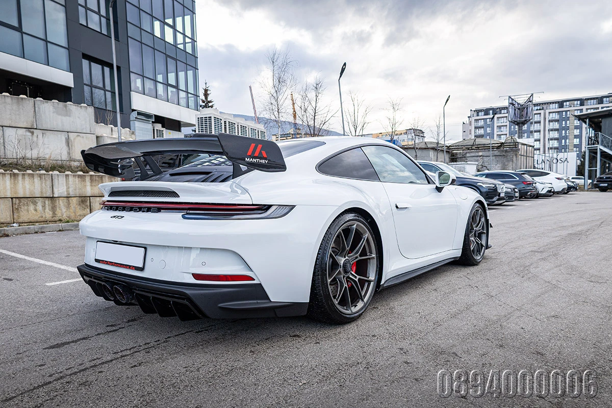 Цена като нова 375 хил. евро, допълнителен пакет MANTHEY - 65 000 EUR, допълнителна генерация CAPRISTO - 15000 EUR; дата на първа регистрация - 26. 02. 2024 г. фейслифт модел 2023 година, Външен цвят - бял /PORSCHE EXCLUSIVE MANUFAKTUR/, интериор ексклузивна черна кожа напа и алкантара в комбинация с червени контрастни конци /PORSCHE EXCLUSIVE MANUFAKTUR/, пълно кожено оборудване от мека и гладка кожа напа с червени контрастни конци /PORSCHE EXCLUSIVE MANUFAKTUR/, орнаменти - карбон, карбон мат и алуминий /PORSCHE EXCLUSIVE MANUFAKTUR/, Черен пакет екстериор /PORSCHE EXCLUSIVE MANUFAKTUR/, спорт дизайн пакет екстериор /PORSCHE EXCLUSIVE MANUFAKTUR/, карбонов капак /PORSCHE EXCLUSIVE MANUFAKTUR/, карбонови спортни седалки /PORSCHE EXCLUSIVE MANUFAKTUR/, Карбонов спойлер MANTHEY, BOSE 3D HIGH END озвучителна система. червени колани /PORSCHE EXCLUSIVE MANUFAKTUR/, триточкови спортни колани /PORSCHE EXCLUSIVE MANUFAKTUR/, всички видове асистенти, гласови команди, спортен ауспух CAPRISTO, всички видове камери, PORSCHE Connect me, KEYLESS START, таван алкантара /PORSCHE EXCLUSIVE MANUFAKTUR/, кожен мултифункционален спортен волан от кожа алкантара с червени контрастни конци /PORSCHE EXCLUSIVE MANUFAKTUR/, спорт хроно пакет с червен циферблат /PORSCHE EXCLUSIVE MANUFAKTUR/, двойни шумоизолирани акустични стъкла, фабрично затъмнени назад стъкла, 2-зонов климатроник, червени спирачни апарати /PORSCHE EXCLUSIVE MANUFAKTUR/, ПОРШЕ ЛЕД матрични фарове и много други. 20 цола оригинални джанти на Порше предни и 21 цола оригинални джанти на Порше задни GT3 с нови гуми. Нов автомобил без удари и забележки, Гаранция от Порше с възможност за удължаване, Нов голям сервиз от Порше включващ всички видове масла, филтри, свещи, спирачна течност и др. Каско и ГО до 02, 2027 г. Крайна цена! ! !