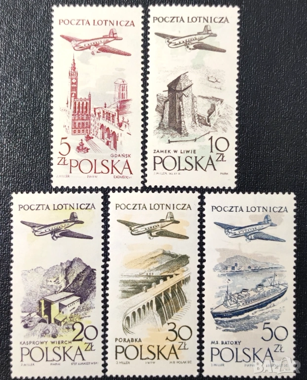 Полша, 1958 г. - лот марки на теми архитектура, риби, самолети, медали, коне, история и др.
