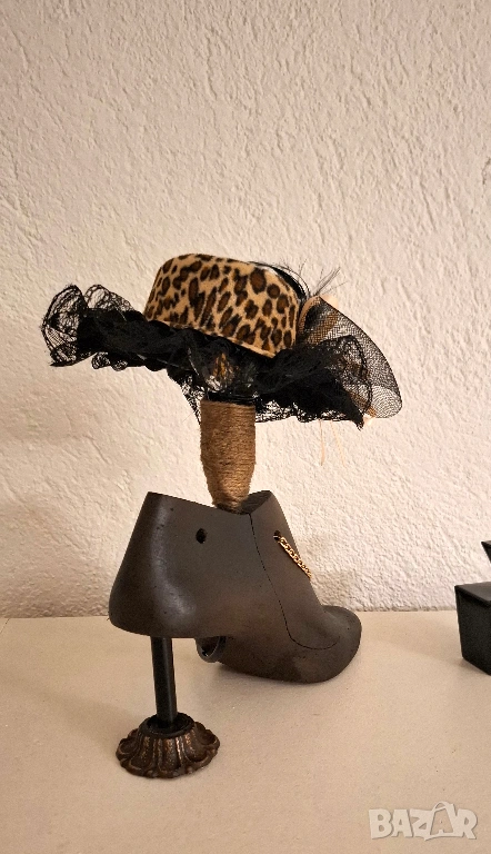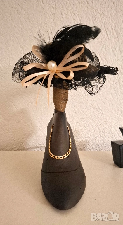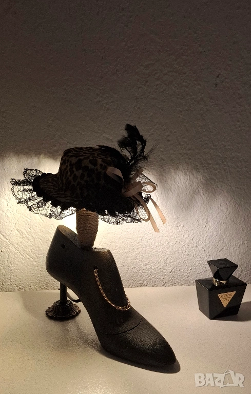 Силуетът е подчертан от декоративна дамска шапка с фина дантела, сатенена панделка, перлен акцент и ефирни пера. Златистата верижка допълва композицията с деликатен блясък и усещане за висша мода.