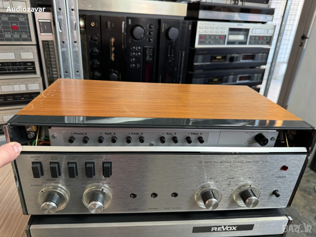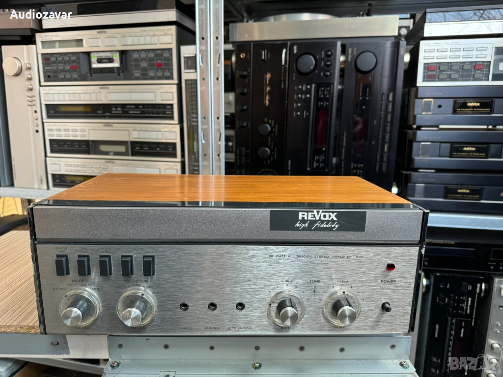 Revox A50 класически стерео интегриран усилвател, произведен в Швейцария и известен с надеждност, неутрално звучене и качествена Hi-Fi конструкция.