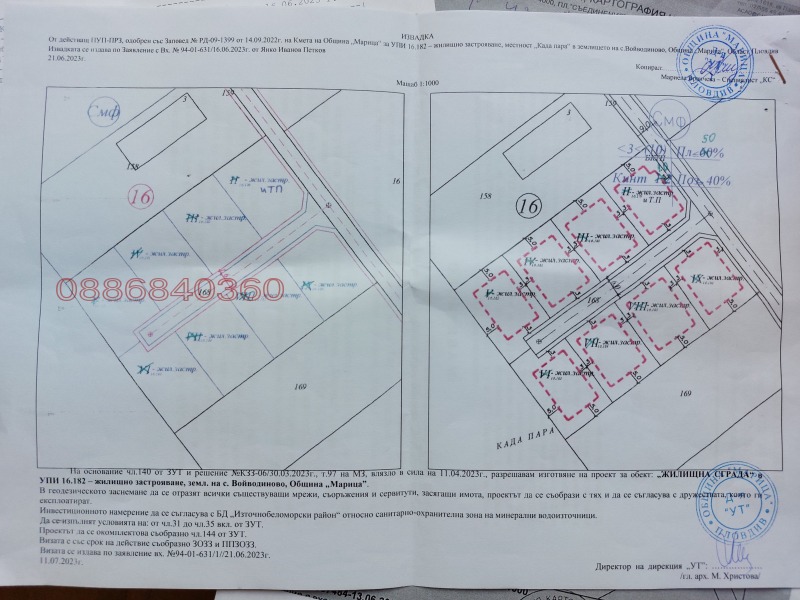 Продава се парцел с номер 181 по приложената схема (УПИ-та за жил. строителство - къщи )намиращи се в землището на с.Войводиново, в регулация: парцел с площ 741 м2 (638 м2 + 103м2 част от пътя) . Цена: 75 евро/м2. Ток, вода и изграден път. Предлагаме строителни услуги от лицензирана Строителна фирма, с регистрация в Камара на строителите. Парцелът се намира на 200м от последна спирка на градски транспорт, на 8км от центъра на Пловдив. Парцела има 22 м лице с южно изложение и 29 м. дълбочина, на тихо и спокойно място, с прекрасна гледка към Родопите. От собственик.