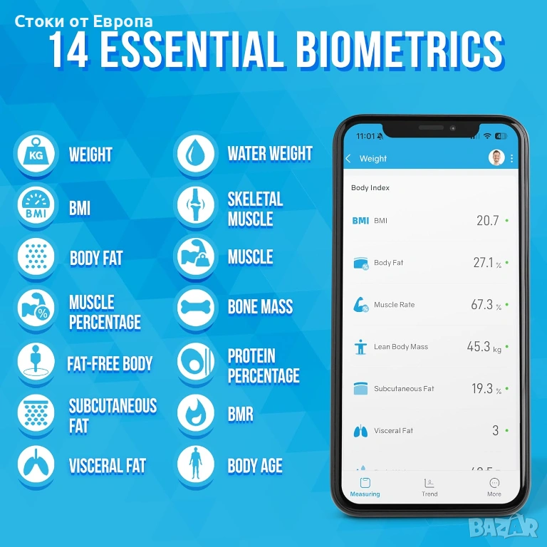 - Приложение за анализ на тялото чрез Bluetooth интелигентната везна за анализ на тялото измерва тегло, мускулна и костна маса, телесни мазнини - включително висцерални и подкожни мазнини, съдържание на вода в тялото, ИТМ и тип тяло, възраст на тялото, степен на затлъстяване, Kcal (дневна нужда), протеин (дневна нужда)