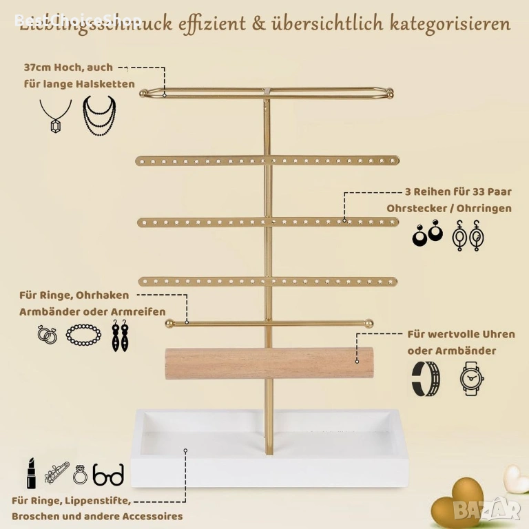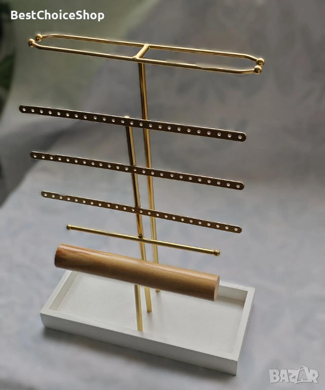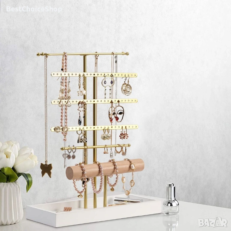 Практична и елегантна стойка за организиране на обеци, колиета, гривни, часовници и пръстени. Подходяща както за лично ползване у дома, така и за витрина или подарък.