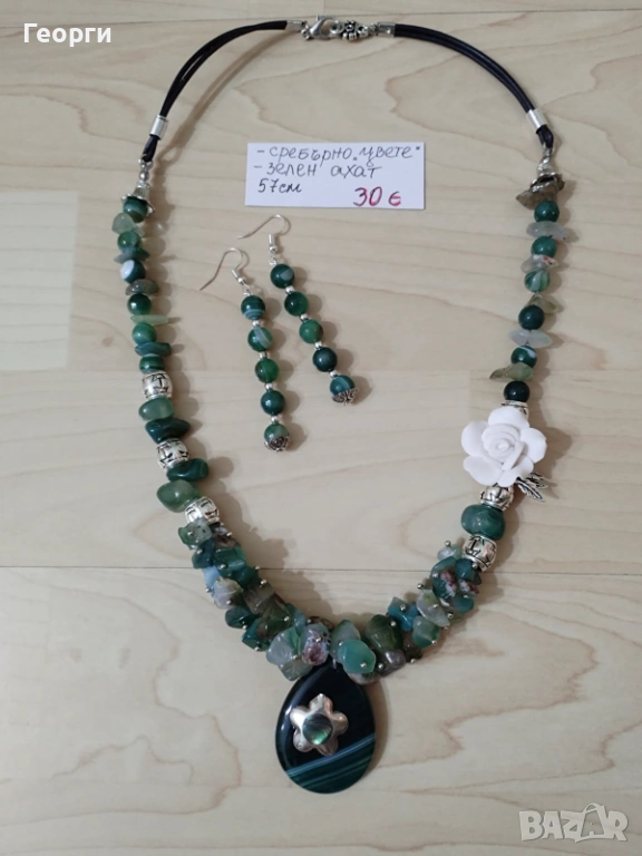 Предлагам стилен и елегантен ръчно изработен комплект бижута, включващ колие и обеци със зелен ахат и декоративни сребристи елементи.