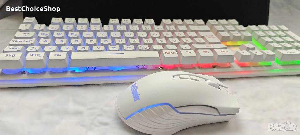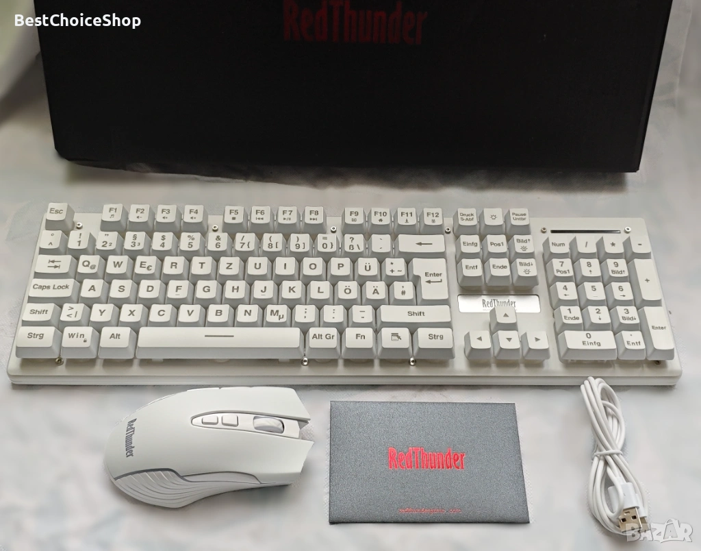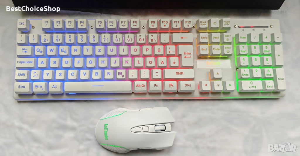 Продавам безжичен комплект RedThunder – пълноразмерна клавиатура с цифров блок + безжична мишка. Комплектът е в бял цвят, стилен дизайн, подходящ както за офис, така и за домашна употреба.