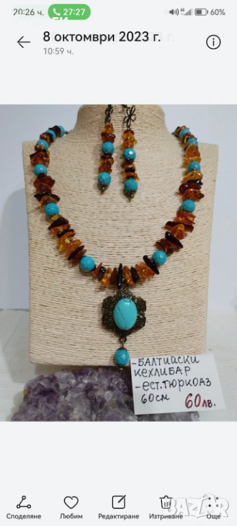 Предлагам изключително елегантен и стилен комплект бижута, изработен от балтийски кехлибар и естествен тюркоаз. Комплектът включва колие и обеци в топли кехлибарени нюанси, комбинирани с наситено син тюркоаз, които създават впечатляващ контраст и луксозно излъчване.