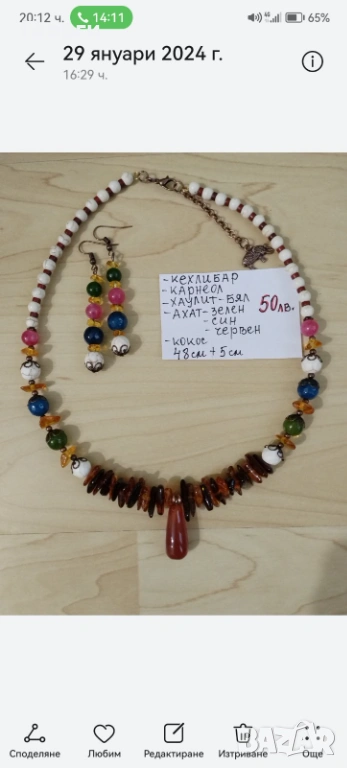 Предлагам красив и цветен ръчно изработен комплект бижута от естествени камъни, включващ колие и обеци. Моделът съчетава топли и наситени нюанси, които придават свежест и характер на всяка визия.