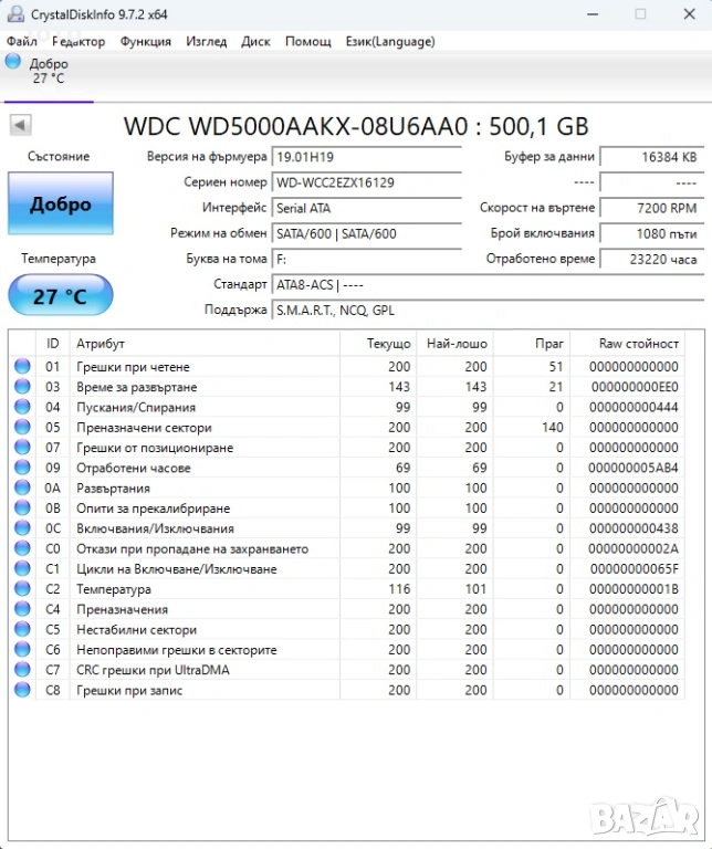 Дискът е тестван с Crystal Disk Info и Sentinel – няма лоши или нестабилни сектори, което е видимо от снимките на теста.