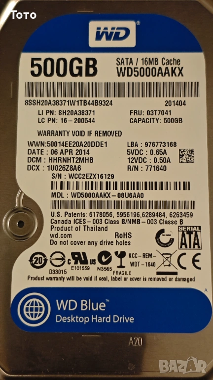 Продавам твърд диск Western Digital WD Blue 500GB, модел WD5000AAKX-08U6AA0.
