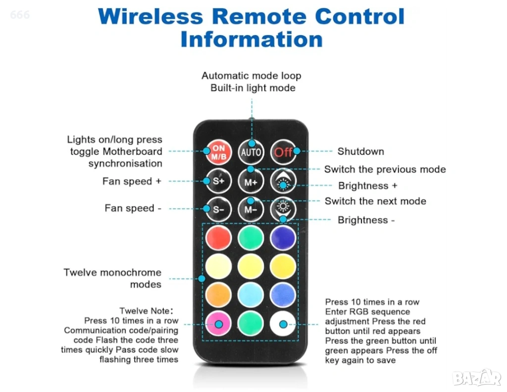 ARGB контролер за вентилаторен хъб: Поддържа до 200 светодиода и осигурява различни светлинни ефекти с безжичното дистанционно управление ARGB контролер за отделни осветителни системи.