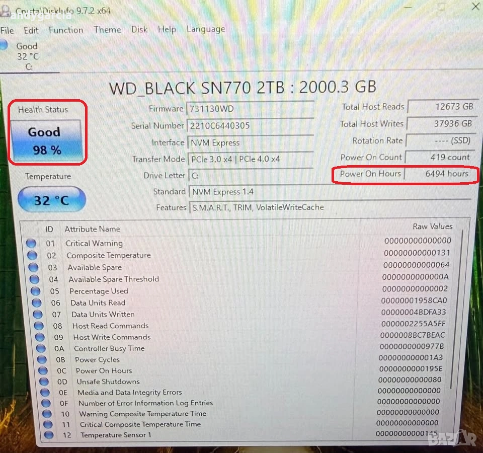 Диска е работил 202 работни дни / 6494 часа/ и е в 100% здраве.