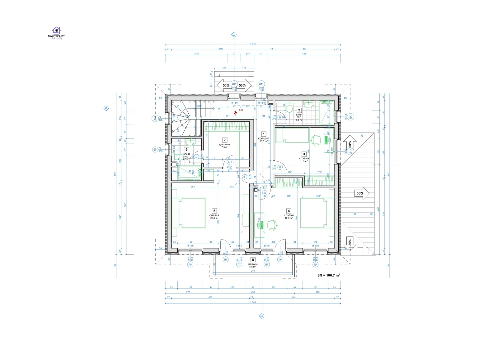 Втори етаж (106,7 кв.м) - коридор, 3 спални, едната с баня и тоалетна и гардеробна, втора баня с тоалетна, балкон.