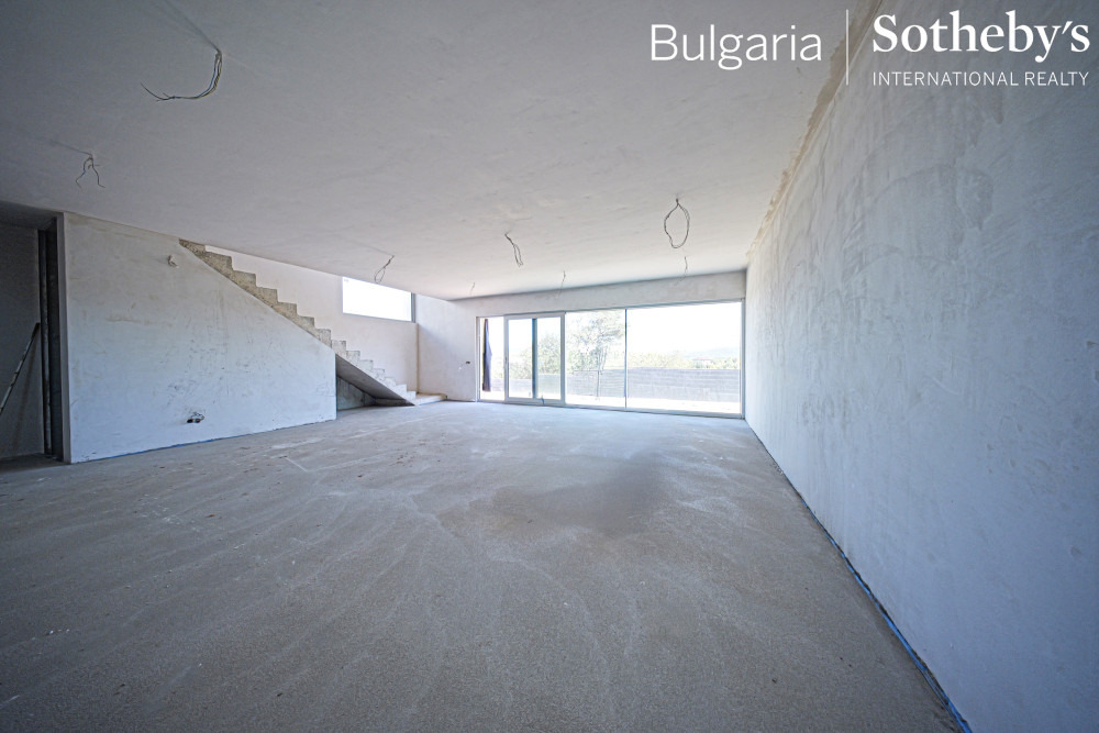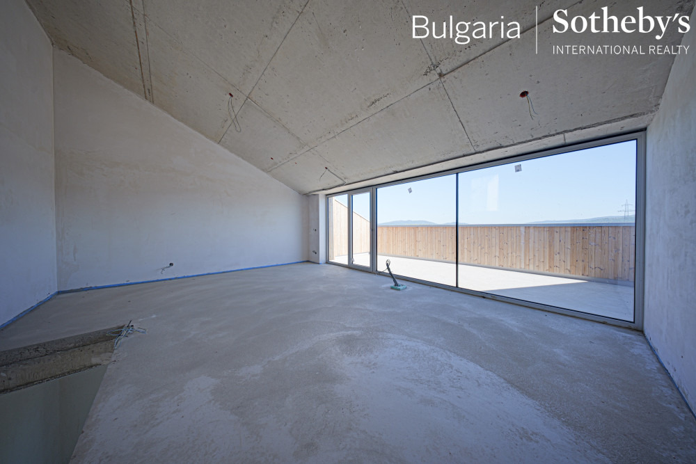 BULGARIA SOTHEBY’S INTERNATIONAL REALTY има удоволствието да представи на Вашето внимание еднофамилна къща в нов затворен комплекс от 8 еднофамилни жилищни сгради скрити в иглолистна гора над Бистришко шосе. Пътният достъп до къщите е организиран подземен и оставя незасегнати парковите и горски площи около къщите. Всички етажи имат директен достъп до външната част, с изключение на най-горното ниво.