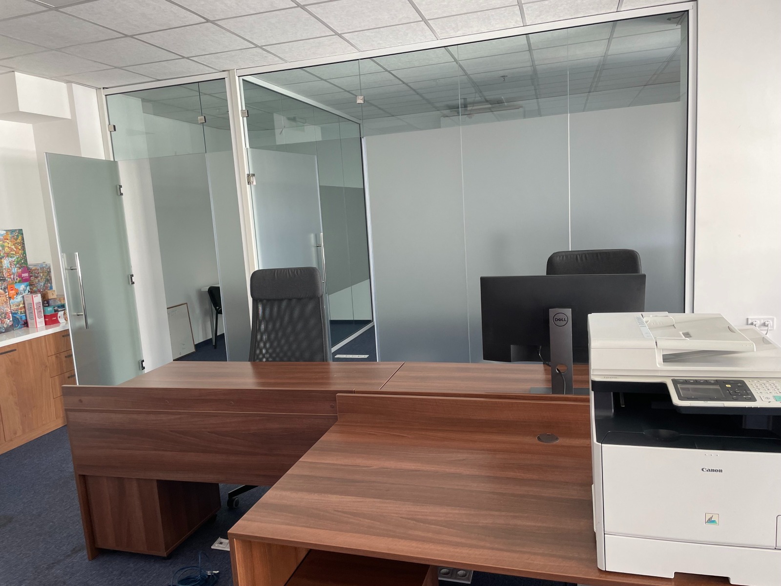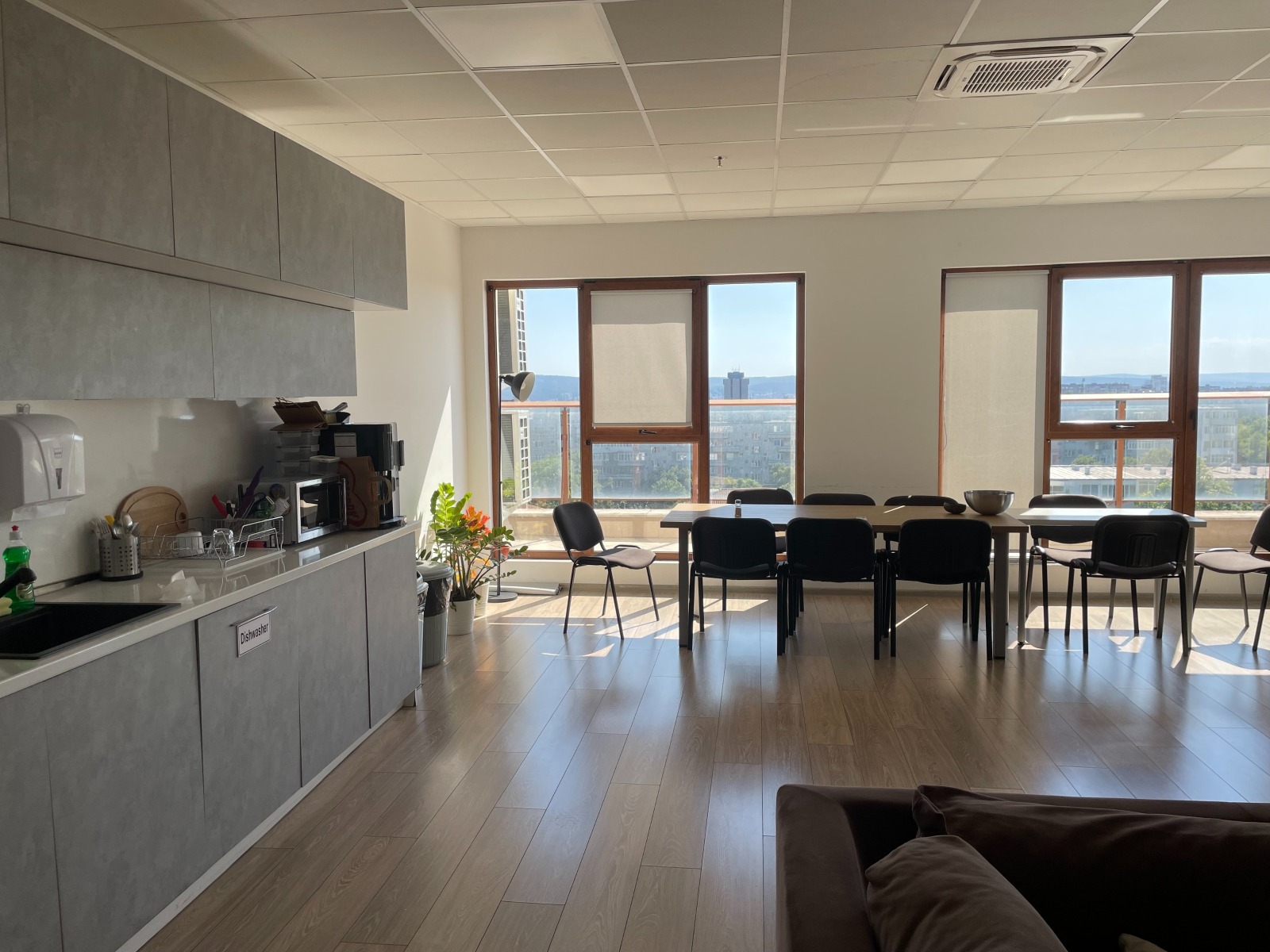 Състои се от вход/рецепция, 3 големи open space зали, 2 малки кабинета, сървър,голяма стая за почивка с напълно оборудвана кухня включително и съдомиялна, 2 дамски и 2 мъжки тоалетни, две остъклени тераси с гледка към града.