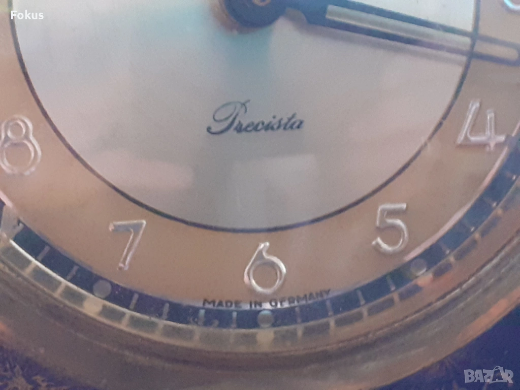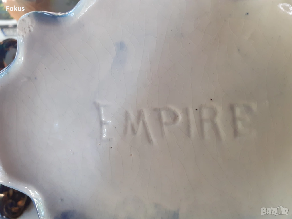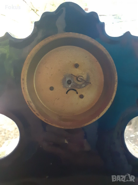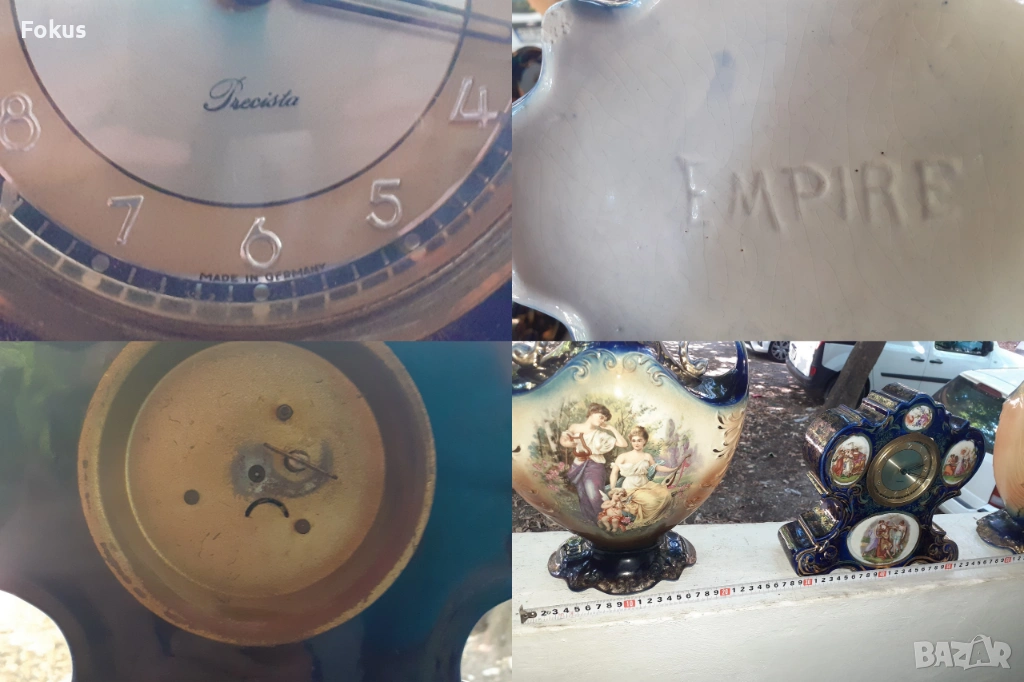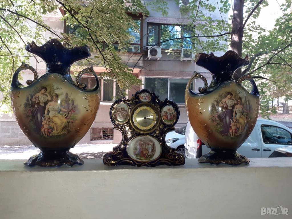 Изрисувани барокови сцени на часовника и на вазите от едната страна ,а от другата страна със цветя.Изобилие от шарки по часовника и вазите нанесени със златна боя.Машината на часовника е немска и не работи. Налични маркировки на порцелановите вази.