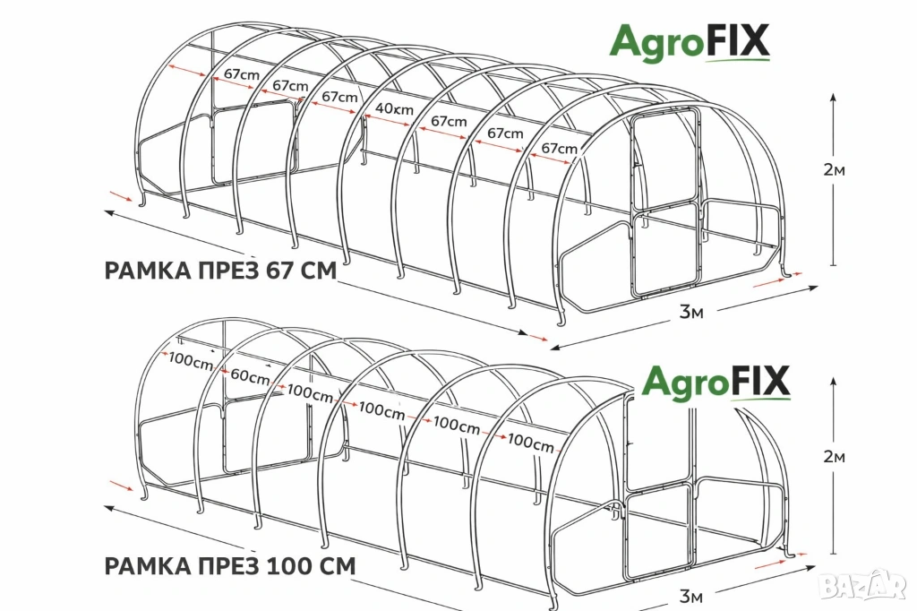 Оранжериите са с размери 300 см ширина, 200 см височина след вкопаване и дължини 4, 6, 8 или 10 м и повече според нуждите на клиента.