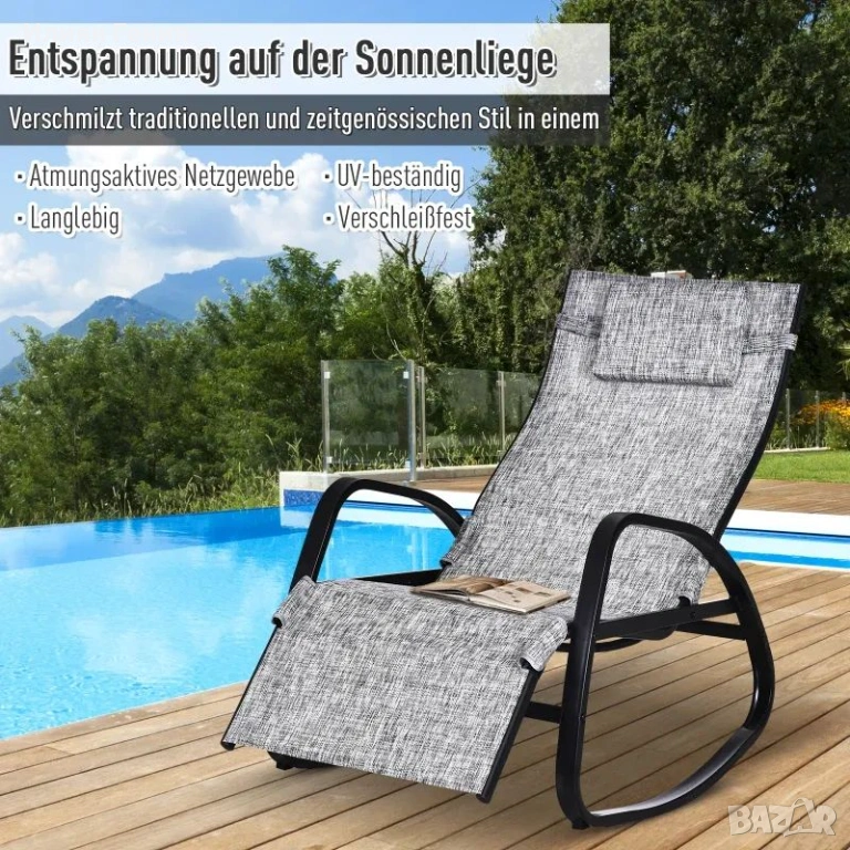Люлеещ се стол Outsunny с регулируема облегалка и поставка за крака, градински шезлонг, Texteline, сив, 64 x 94 x 108 см - 85.00€.