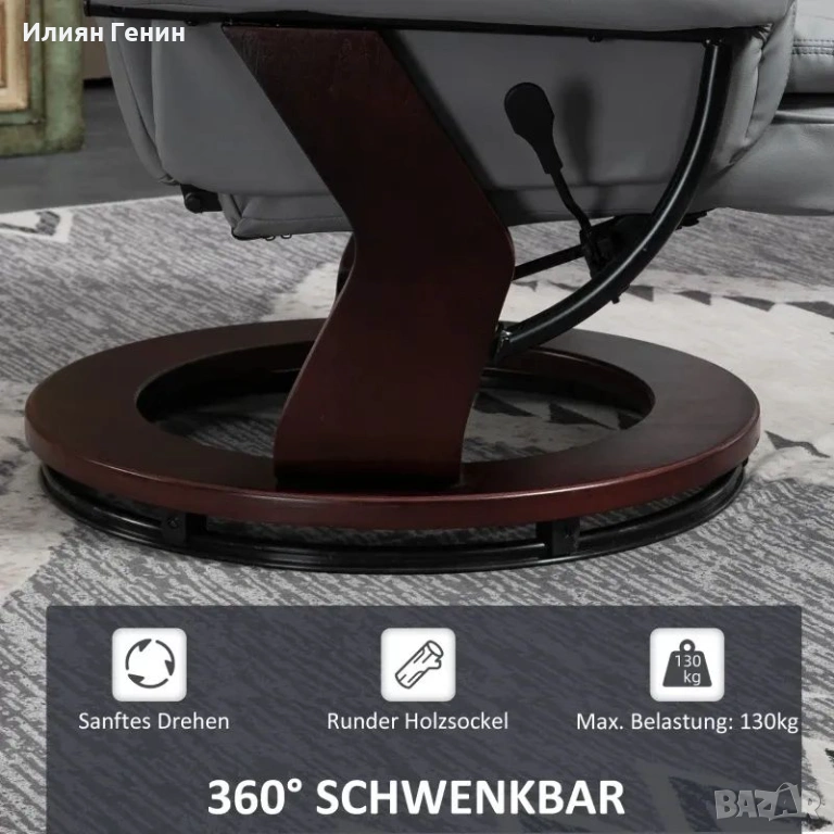 HOMCOM Реклайнер с табуретка, Въртящ се стол, Накланяща се облегалка, Кожен вид, до 130 кг, Сив - 230.00€.