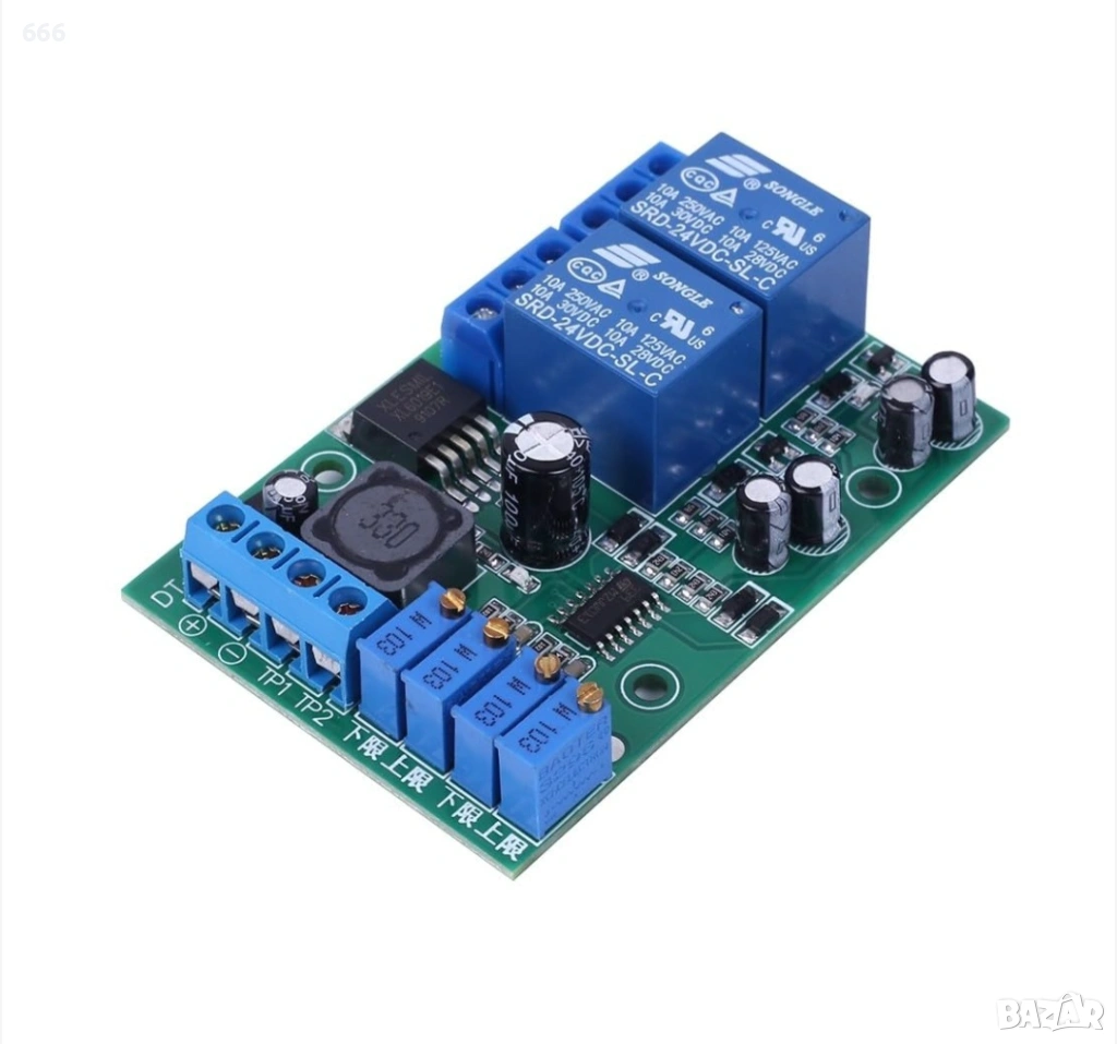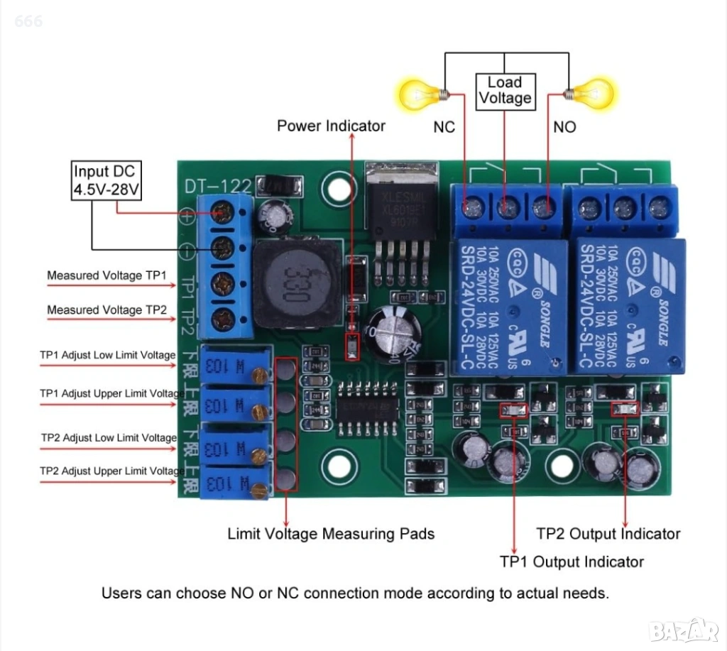 3. Релето ще се включи, ако входното напрежение от TP1 (TP2) е в диапазона на горната/долната гранична стойност на напрежението. В противен случай релето ще остане изключено.