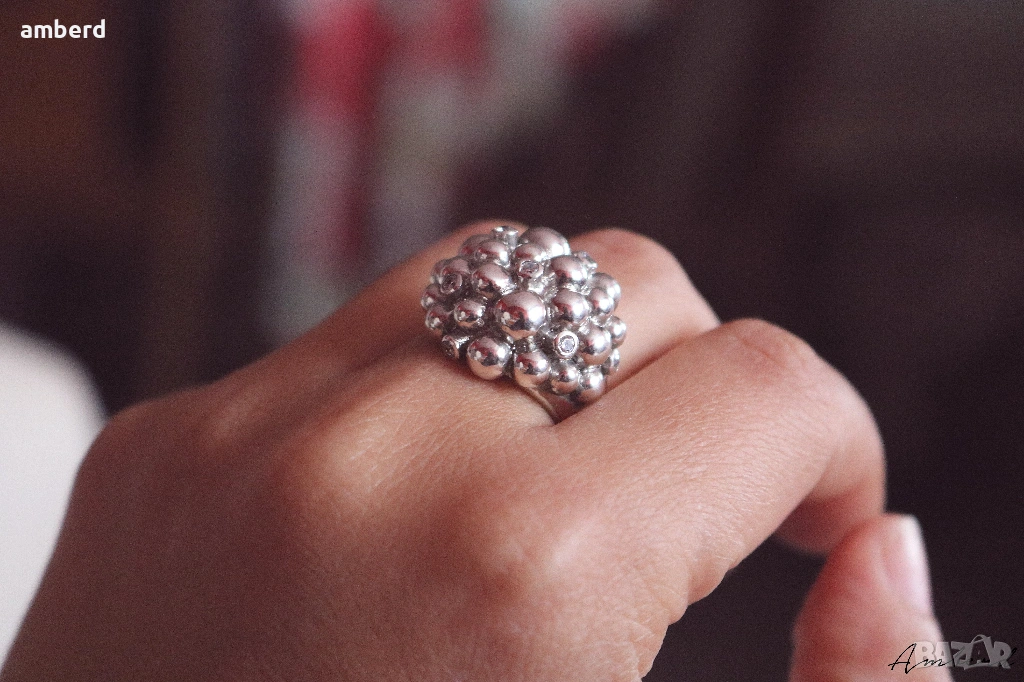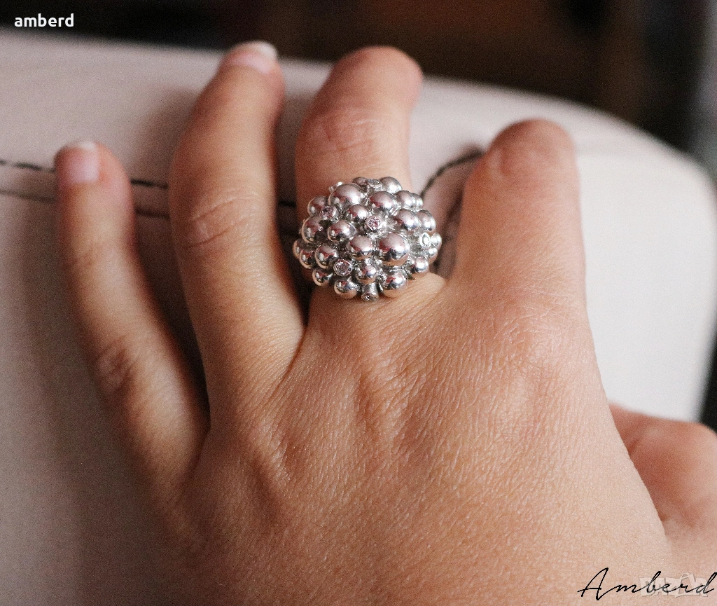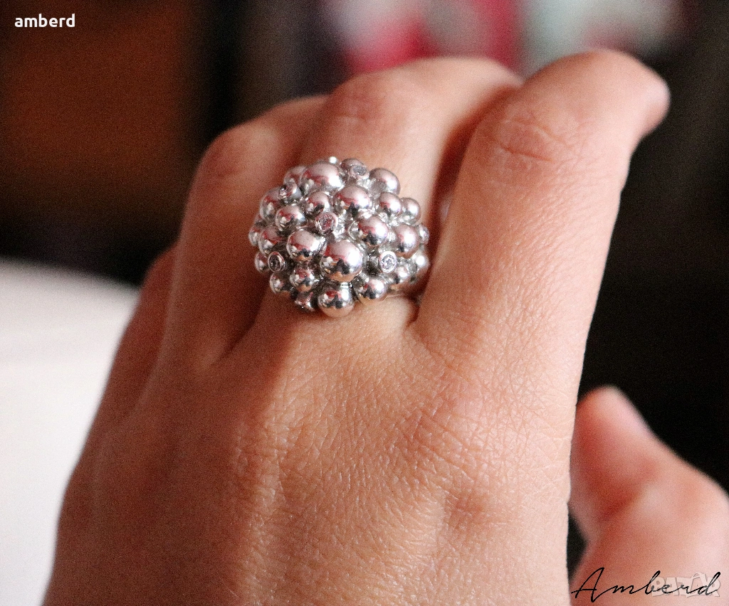 Много красив и масивен пръстен с 9бр. бели циркония, изработен от сребро проба 925. Вътрешен диаметър - 17.5мм. Тегло - 10.58гр.