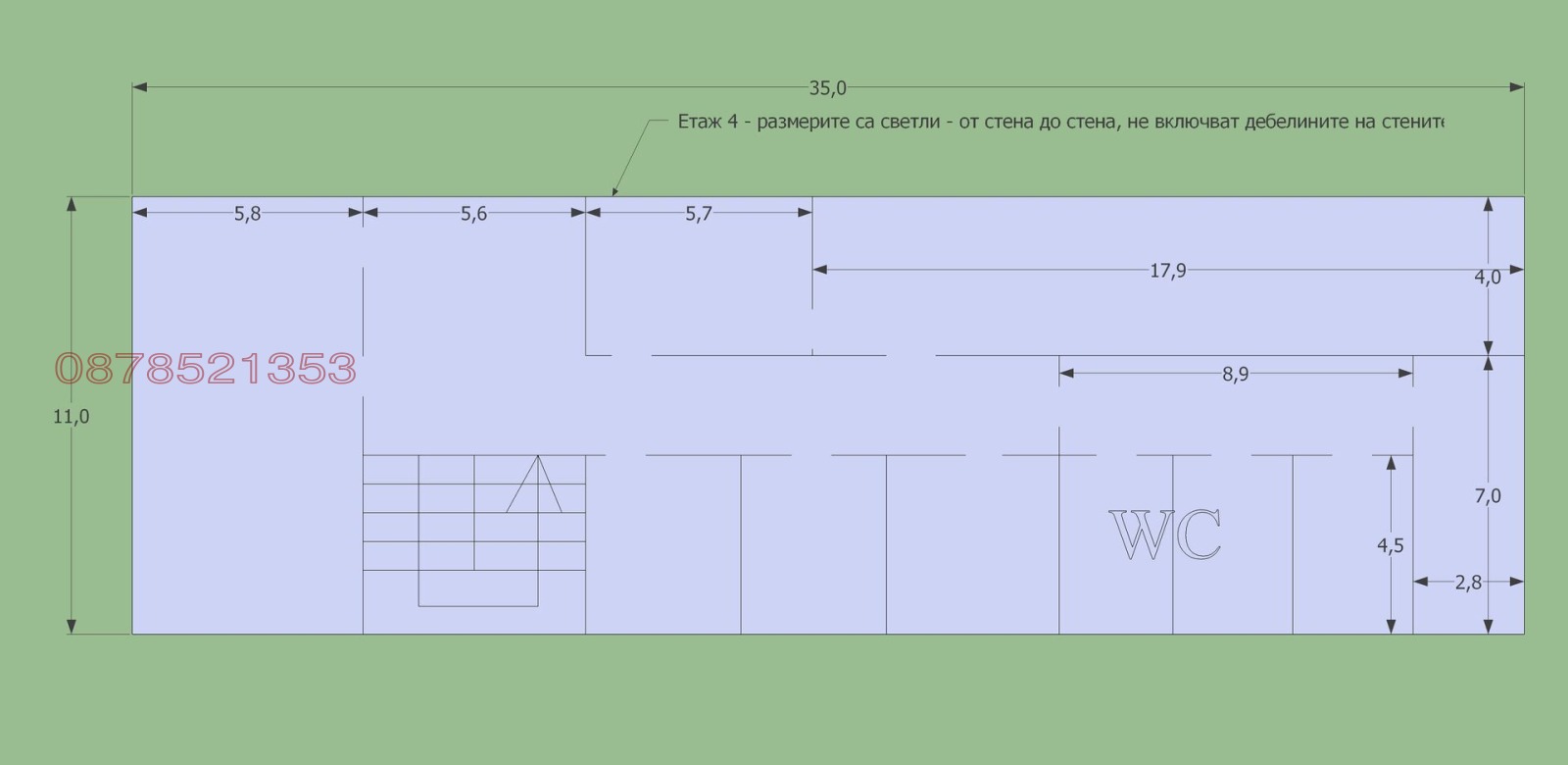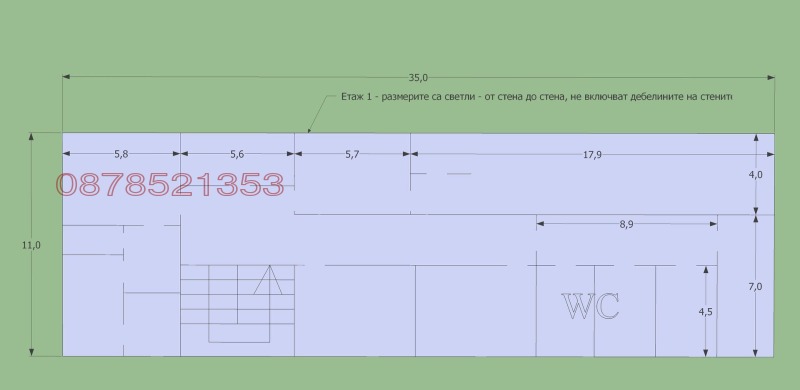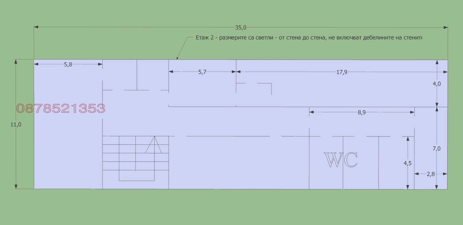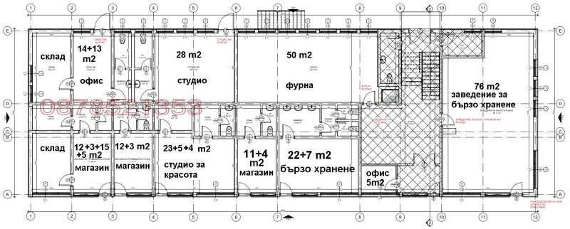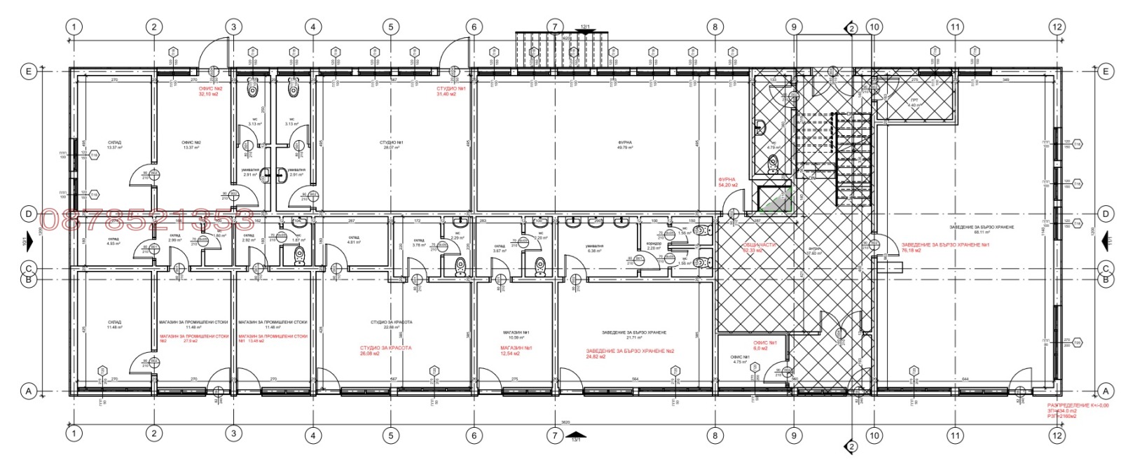 Всяко търговско помещение на 1ви етаж си има склад и тоалет. Разпределението на помещенията се вижда от скицата. Площа означена на скицата е: търговската площ+склада.