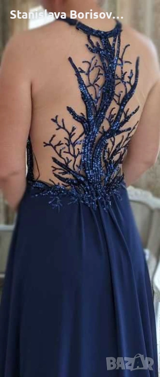 Продавам официална дълга рокля в тъмносин цвят. Моделът е с блестящо бродирано бюстие, ефектен прозрачен гръб с апликации и елегантна падаща пола с цепка. Идеална за бал, сватба или специален повод. Роклята е обличана само веднъж и носена на химическо, роклята е без забележки!