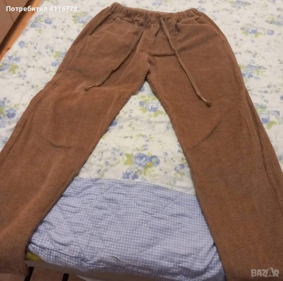 Продавам дамски джинси в бежов цвят от кадифе, размер L. В перфектно състояние.Имат странични джобове и са на ластик.За подробности ми пишете.Подарък са и не са моя размер.Размура е L а не 33
