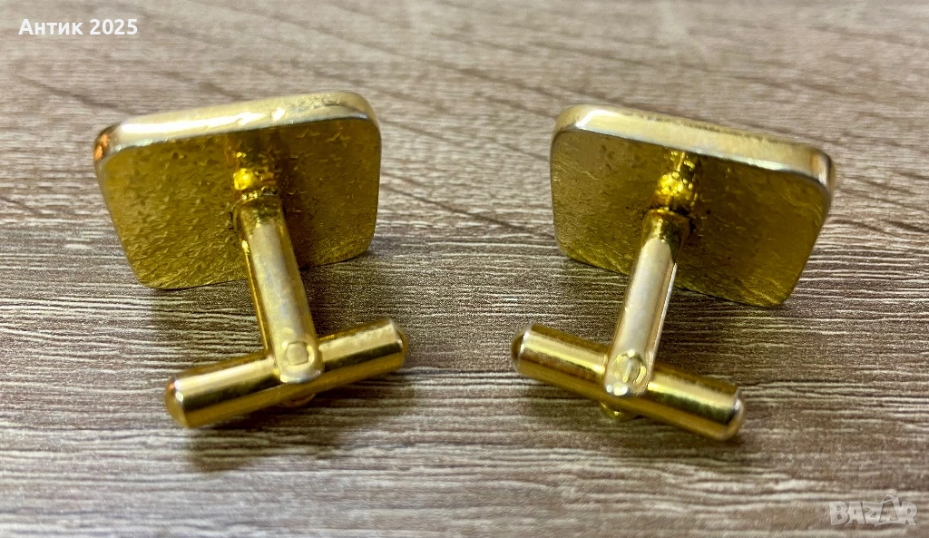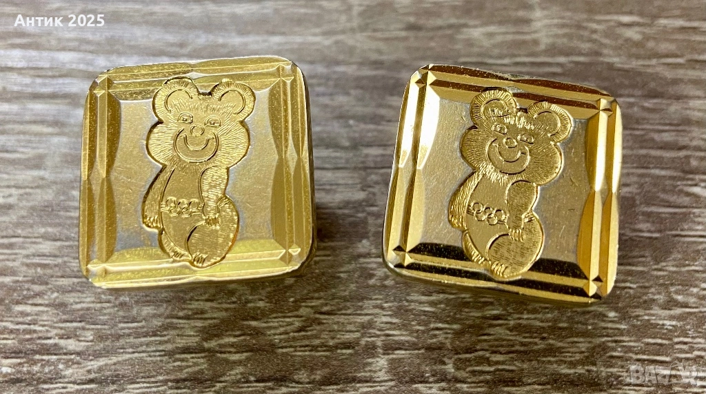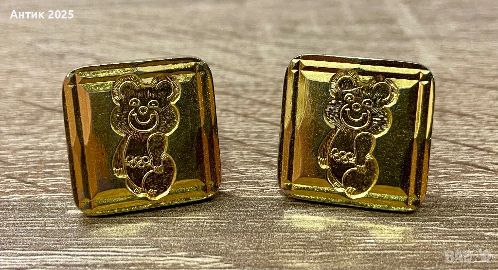 винтидж копчета за ръкавели с изображение на Олимпийското мече — талисмана на Олимпийските игри в Москва през 1980 г. Изработени в златист тон, с релефно изображение на усмихнатото мече и елегантна геометрична рамка.