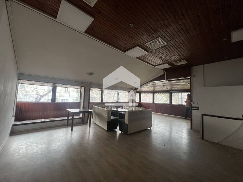 Отдаваният под наем етаж представлява просторна основна зала с обособена бар зона и кухня, оборудвана с аспирация.