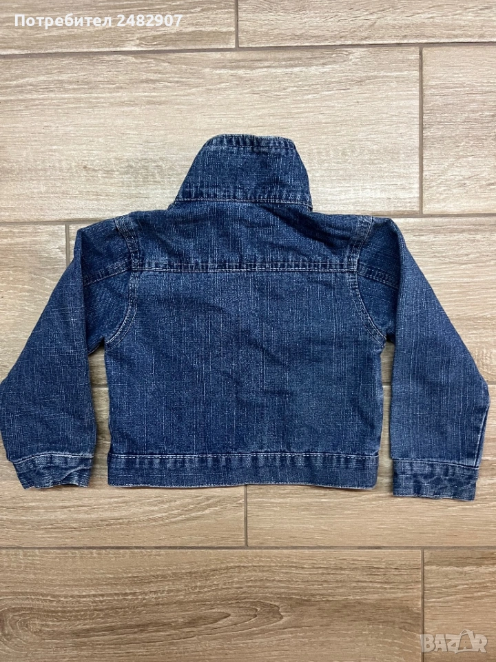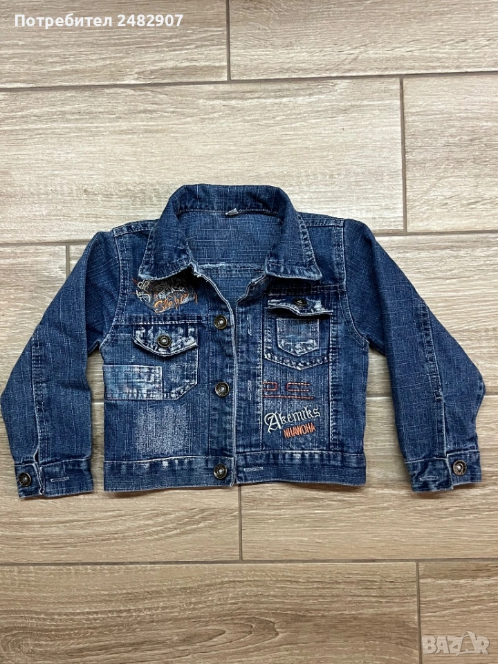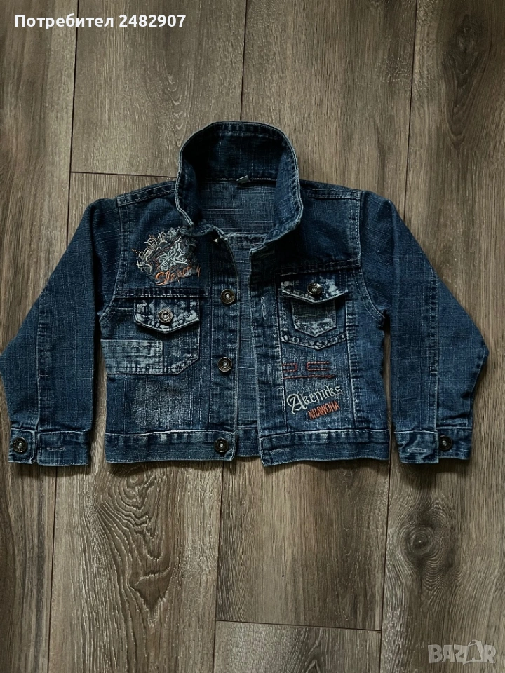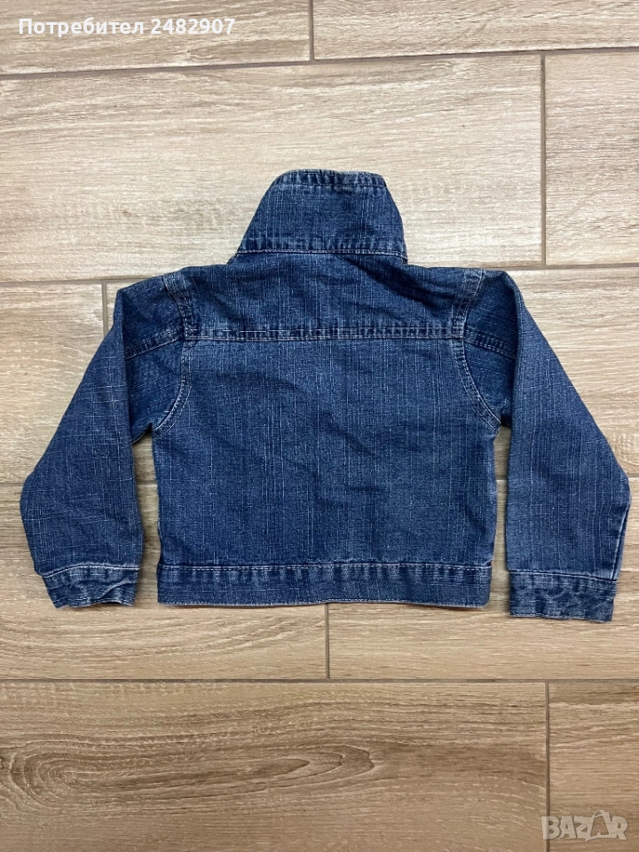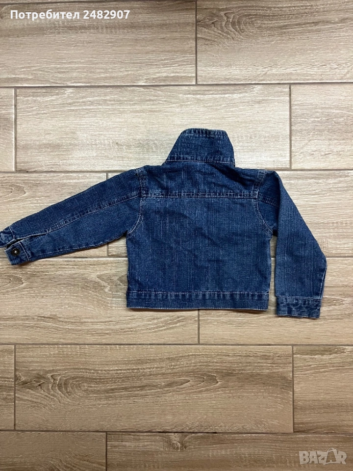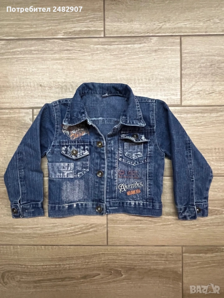 Тъмно синьо детско дънково яке за възраст 3-4 години. Ширина в раменете - 28 см, ширина под мишниците - 30 см, ширина в долната част - 30 см, дължина от рамото до долу - 33 см, дължина на ръкава от рамото - 34 см, ширина на ръкава в долната част - 7 см. Много запазено, почти не е използвано, без забележки.