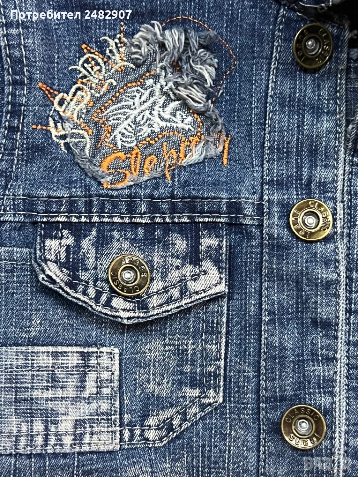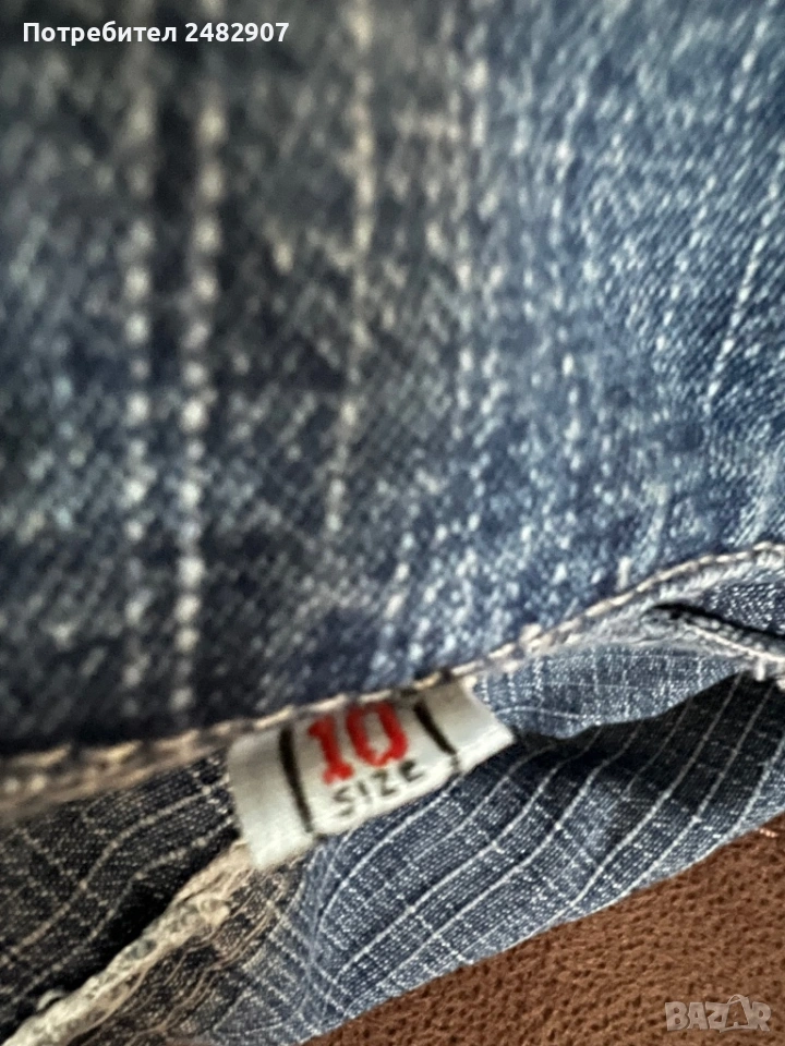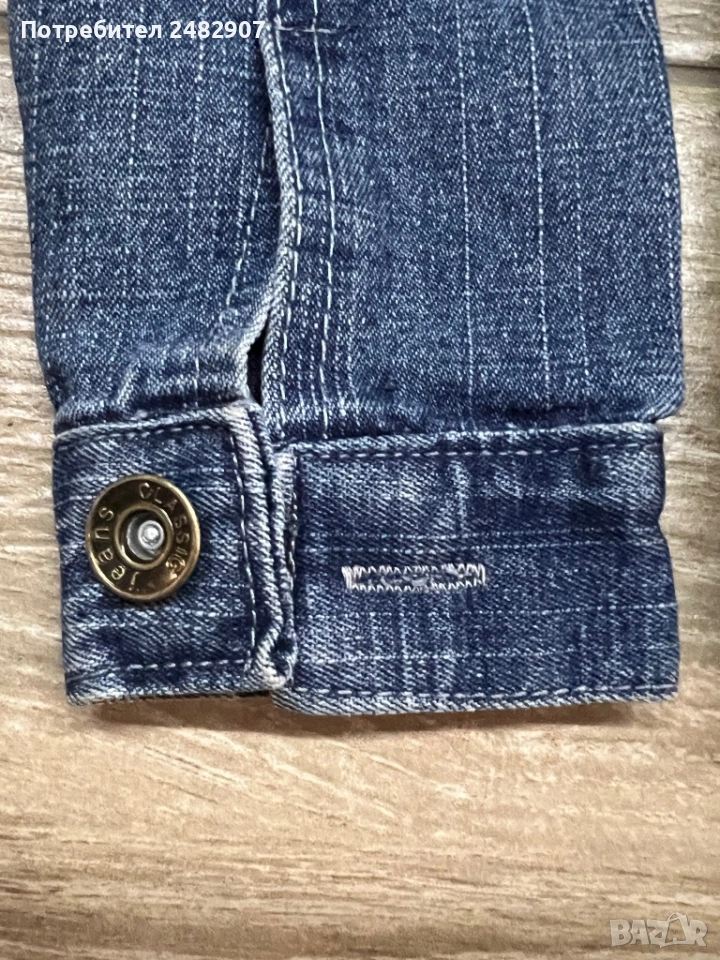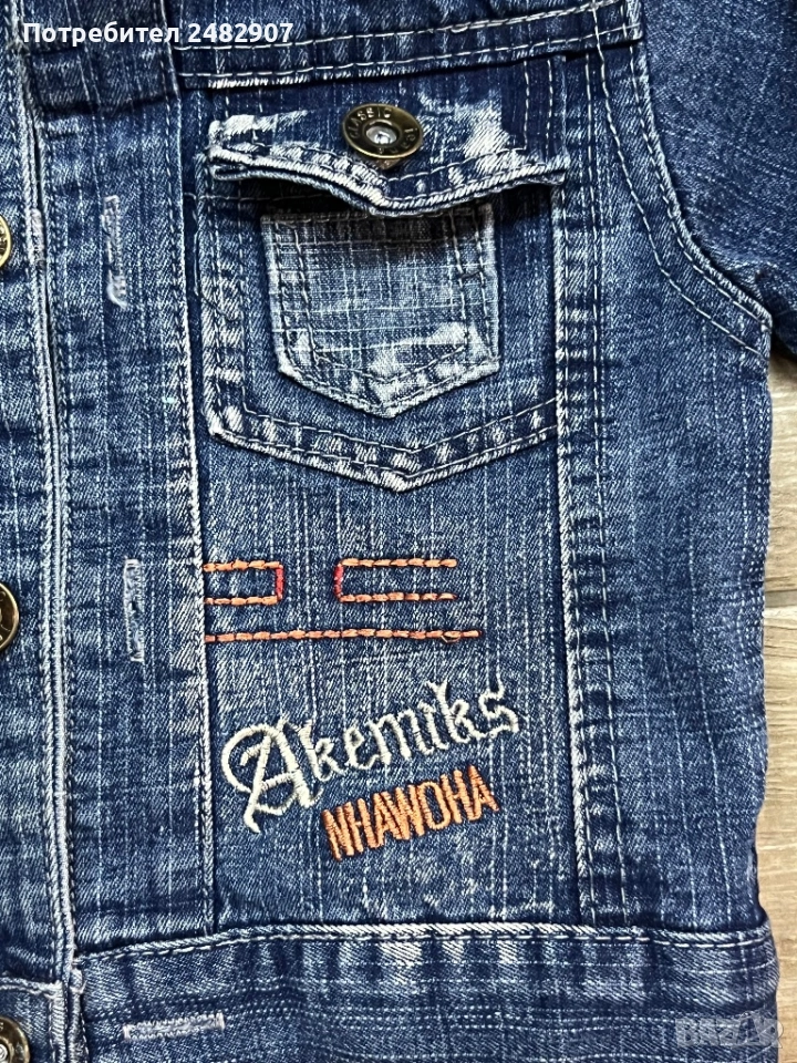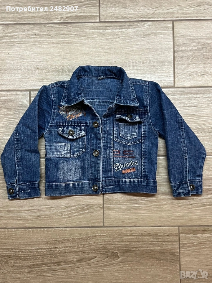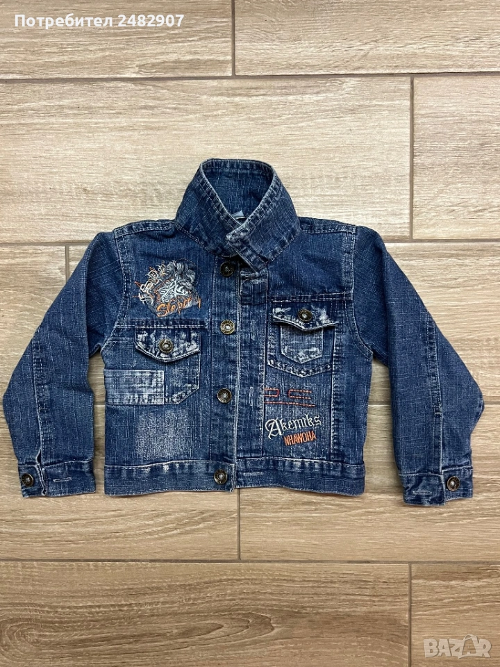 Тъмно синьо детско дънково яке за възраст 3-4 години. Ширина в раменете - 28 см, ширина под мишниците - 30 см, ширина в долната част - 30 см, дължина от рамото до долу - 33 см, дължина на ръкава от рамото - 34 см, ширина на ръкава в долната част - 7 см. Много запазено, почти не е използвано, без забележки.