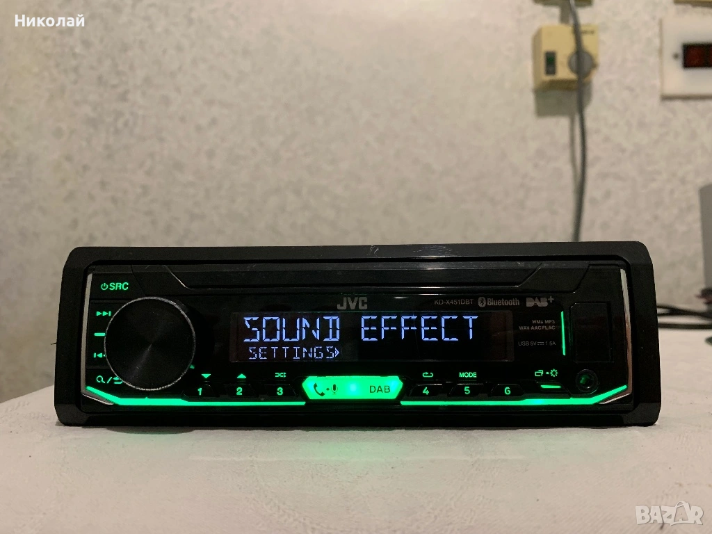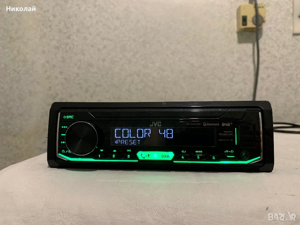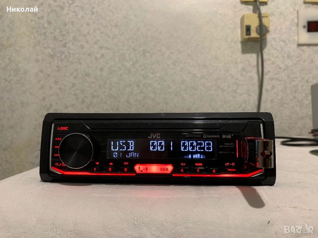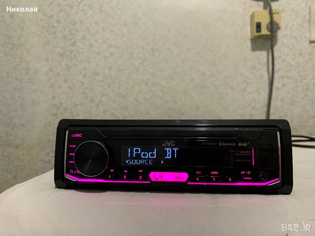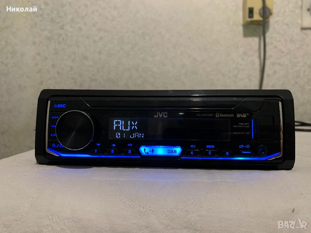 Авто плеър JVC в много добро състояние.Смяна на цветове,множество звукови настройки!Работи безпроблемно на:флашка(USB),аукс,блутут и радио!