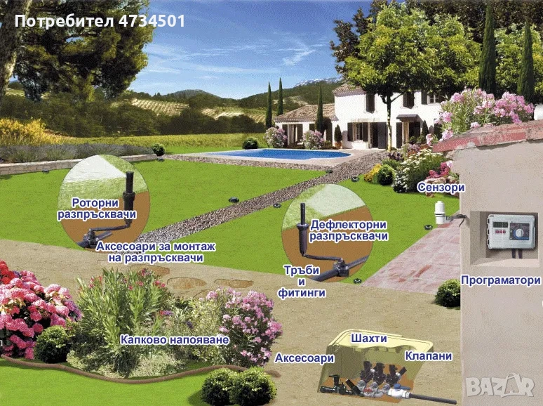 • капково напояване и разпръсквачи