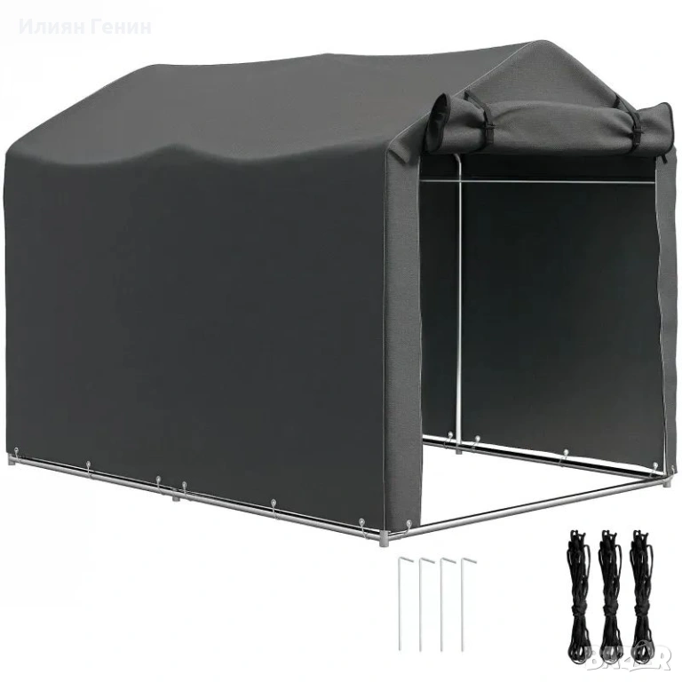 Здрава конструкция: С поцинкована метална рамка, тази гаражна палатка предлага устойчивост на напукване, ръжда и корозия. Допълнителна стабилност се осигурява от земни анкери и обтегателни въжета.