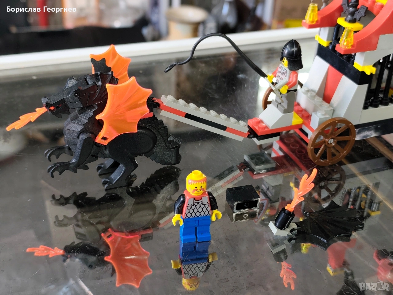 Комплекта е без книжка и кутия.Липсва опашката на дракона,единия държач е счупен на бронята на коня,липсва хромирания меч,веригата е от новите части на Лего,липсва една брадва,липсва наметалото и един шлем.Останалите липси се виждат на последните снимки.