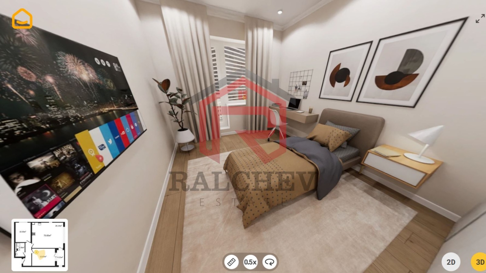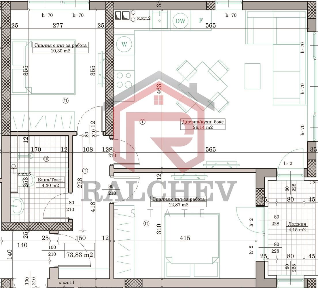 Просторният дневен тракт позволява обособяване на кухненска част, трапезария и комфортна холна зона. Двете спални са функционални и подходящи за семейство с дете или за комбиниране на спалня и домашен офис. Лоджията осигурява допълнително пространство и естествена светлина.