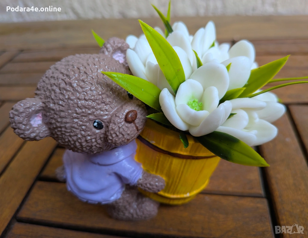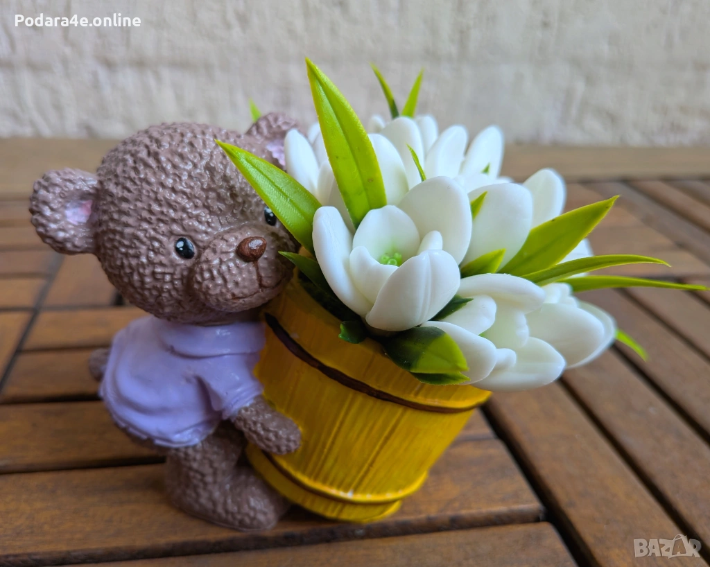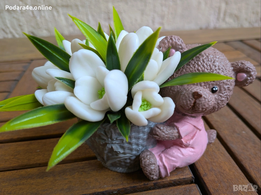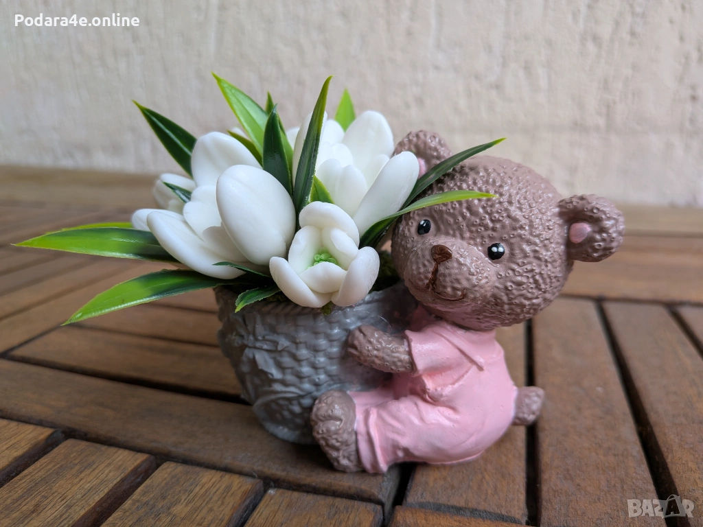 Керамична кашпа мече с кокичета от сапун – символ на надежда, ново начало и чистота. 🌿✨