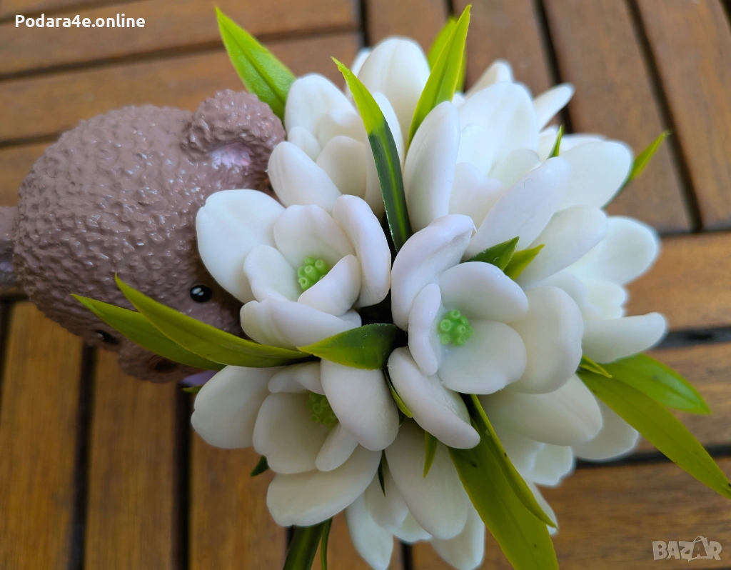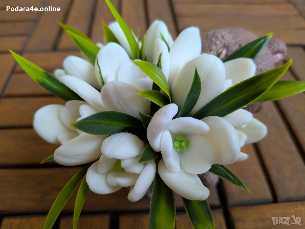 Букет свежи кокичета от ароматен сапун в керамична кашпа мече → Обява 53464091