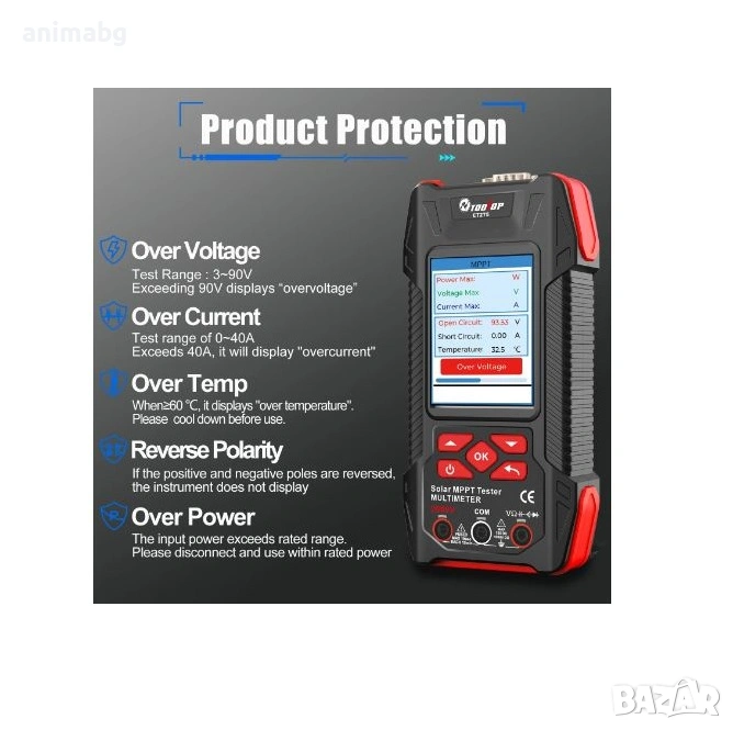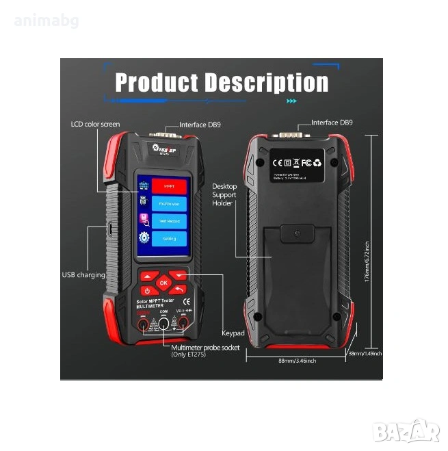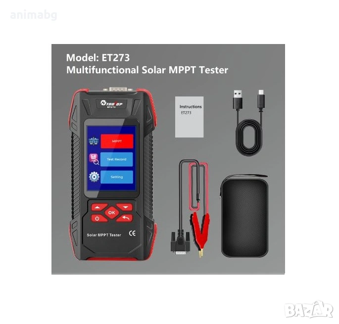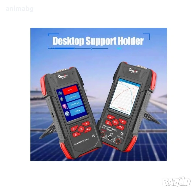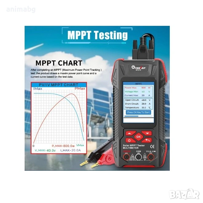 Това е професионален инструмент за тестване на слънчеви панели и фотоволтаични системи. С помощта на този мултиметър можете лесно да измервате и анализирате важни параметри като Pmax (максимална мощност), Voc (напрежение на отворена верига), Isc (ток на късо съединение) и да следите MPPT (Maximum Power Point Tracking) криви. Тестерът е оборудван с 3.2 инчов LCD екран, който осигурява ясни и точни измервания в реално време. Незаменим инструмент за професионалисти и техници, които работят със слънчеви панели и фотоволтаични системи, осигуряващ точни и надеждни резултати при всяко измерване.