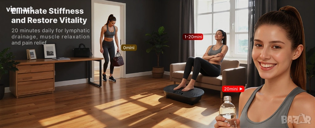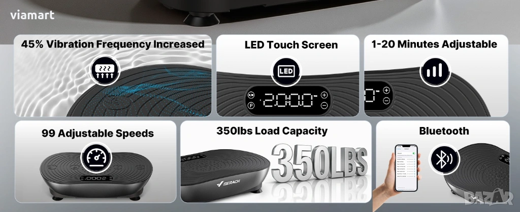 Вибро платформа MERACH V33 Black е компактно и мощно решение за стягане, тонус и стимулиране на кръвообращението. Работи в оптимален диапазон 8–14Hz с 45% по-интензивни вибрации, което активира мускулатурата и подпомага лимфния дренаж и възстановяването след натоварване. Подходяща е както за начинаещи, така и за активни хора – настройваш интензивността според целта си и започваш веднага.