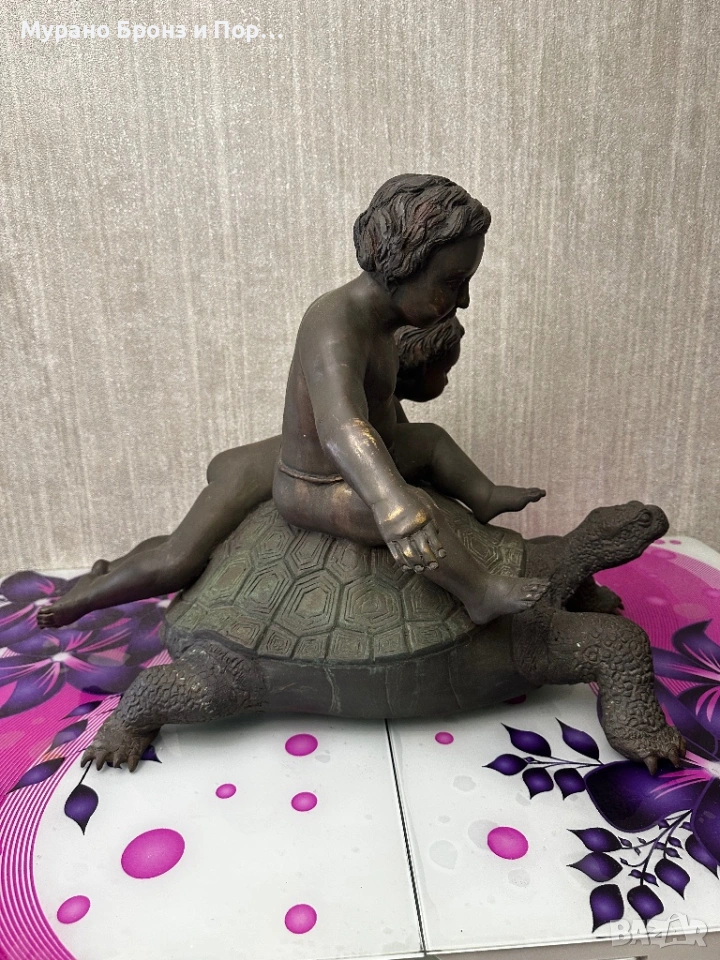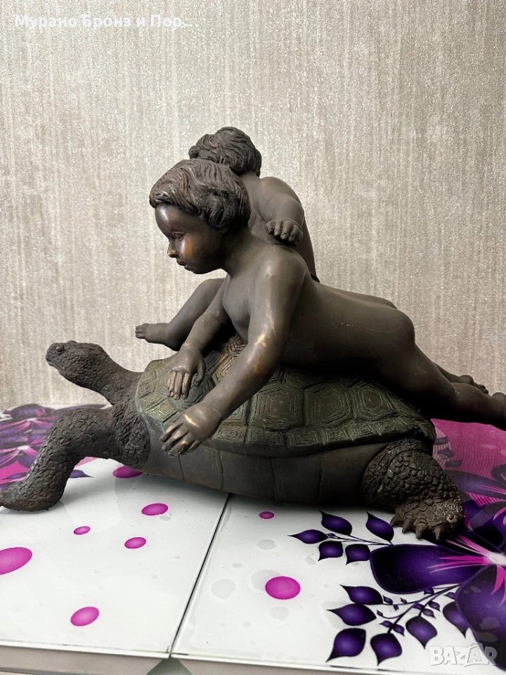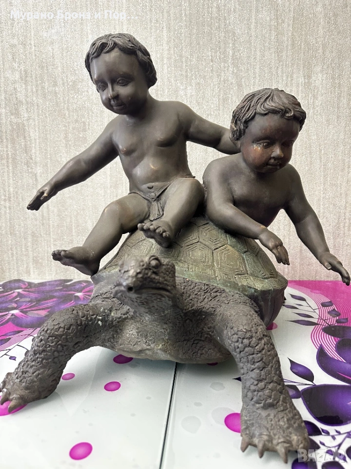 Продавам изключително масивна и детайлна бронзова скулптура на две деца, яздещи голяма костенурка. Предметът е с много сериозни размери и тегло, подходящ за престижен имот, градина или интериорен акцент.